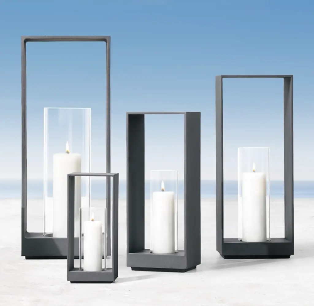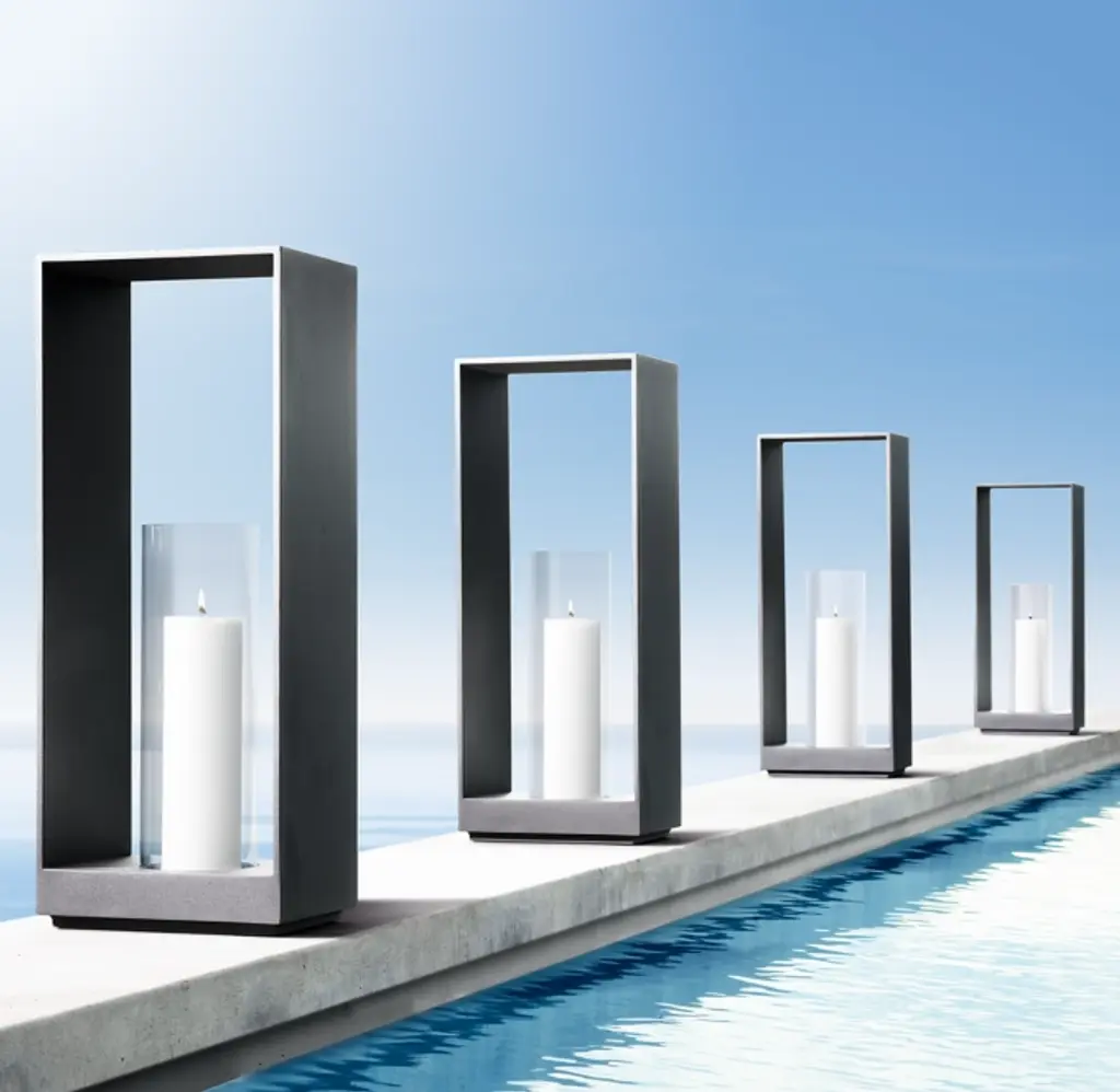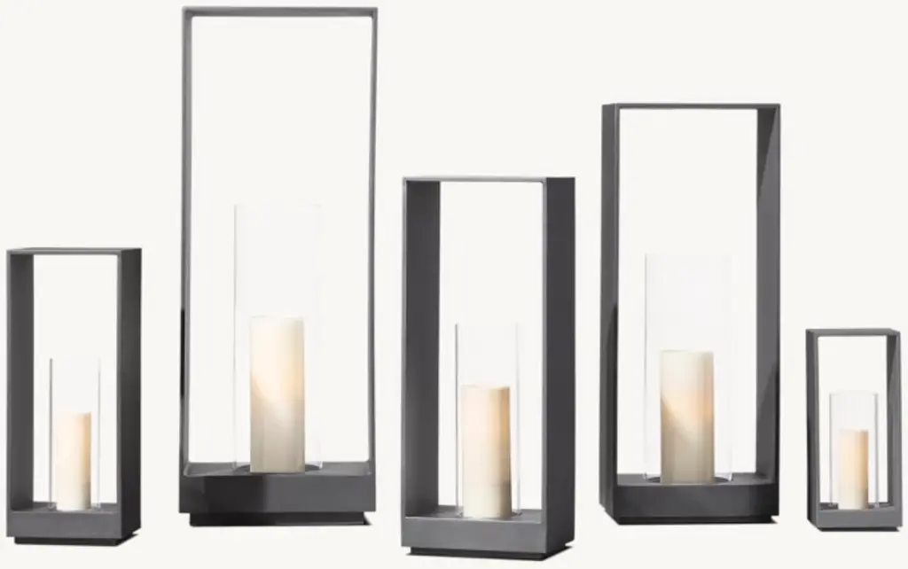 Designer Jonathan Browning brings his singular mastery of geometric forms to the outdoor lantern. The rectangular, open frame is handcrafted of cast aluminum, its crisp, unadorned contours creating an airy architecture for the circular pillar housed within.