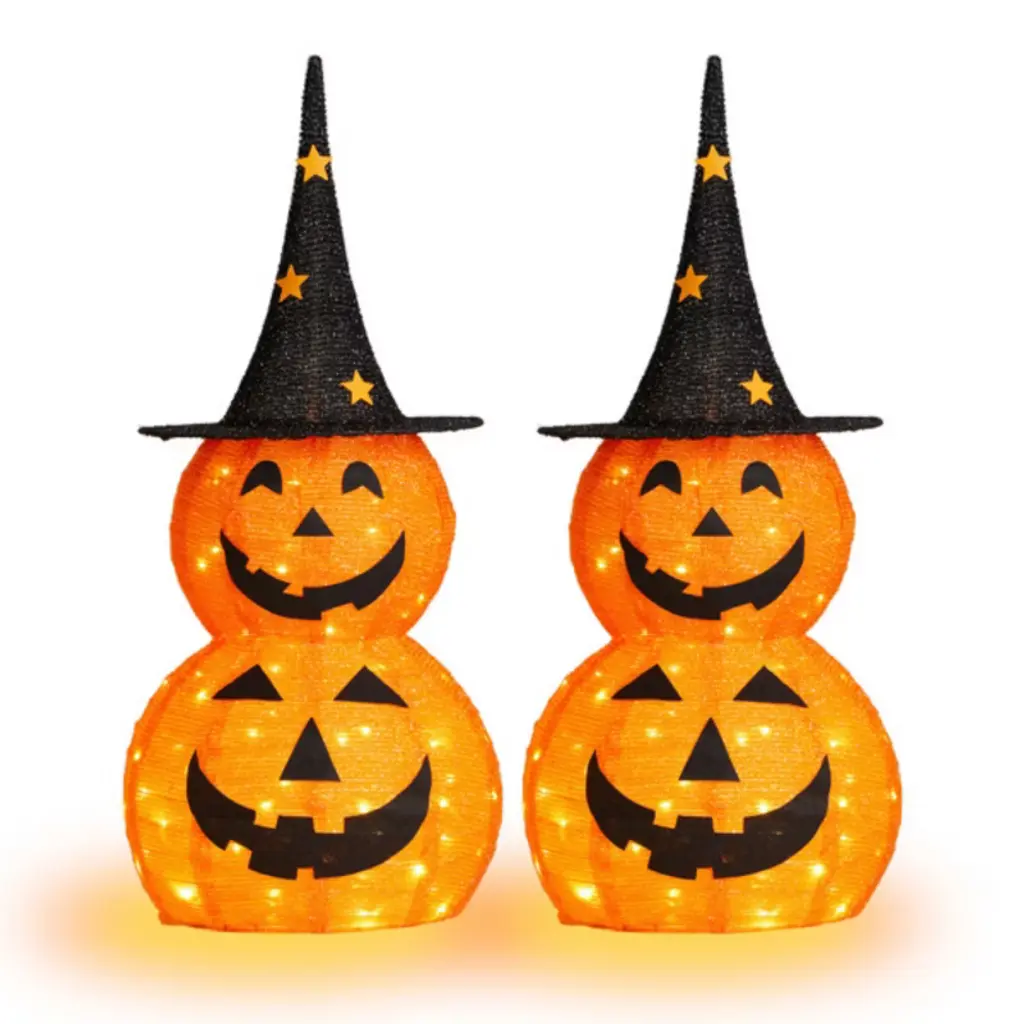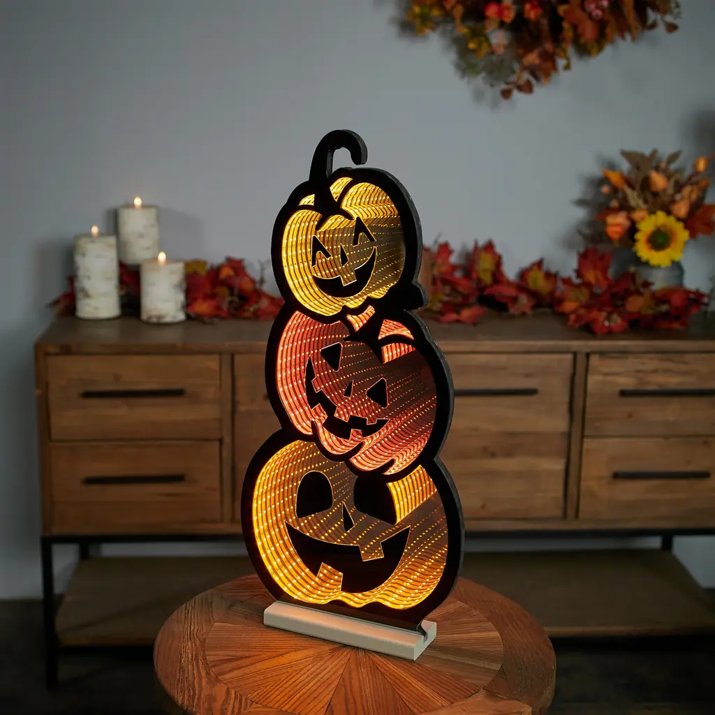 Spook up your Halloween décor with the Triple Jack-o-Lantern Ekkolight! This stacked trio of glowing pumpkins features built-in LED lights that create an eerie yet fun ambiance for your home. Perfect for porches, entryways, or living rooms, this lighted Halloween accent brings festive energy and seasonal charm to your celebrations.