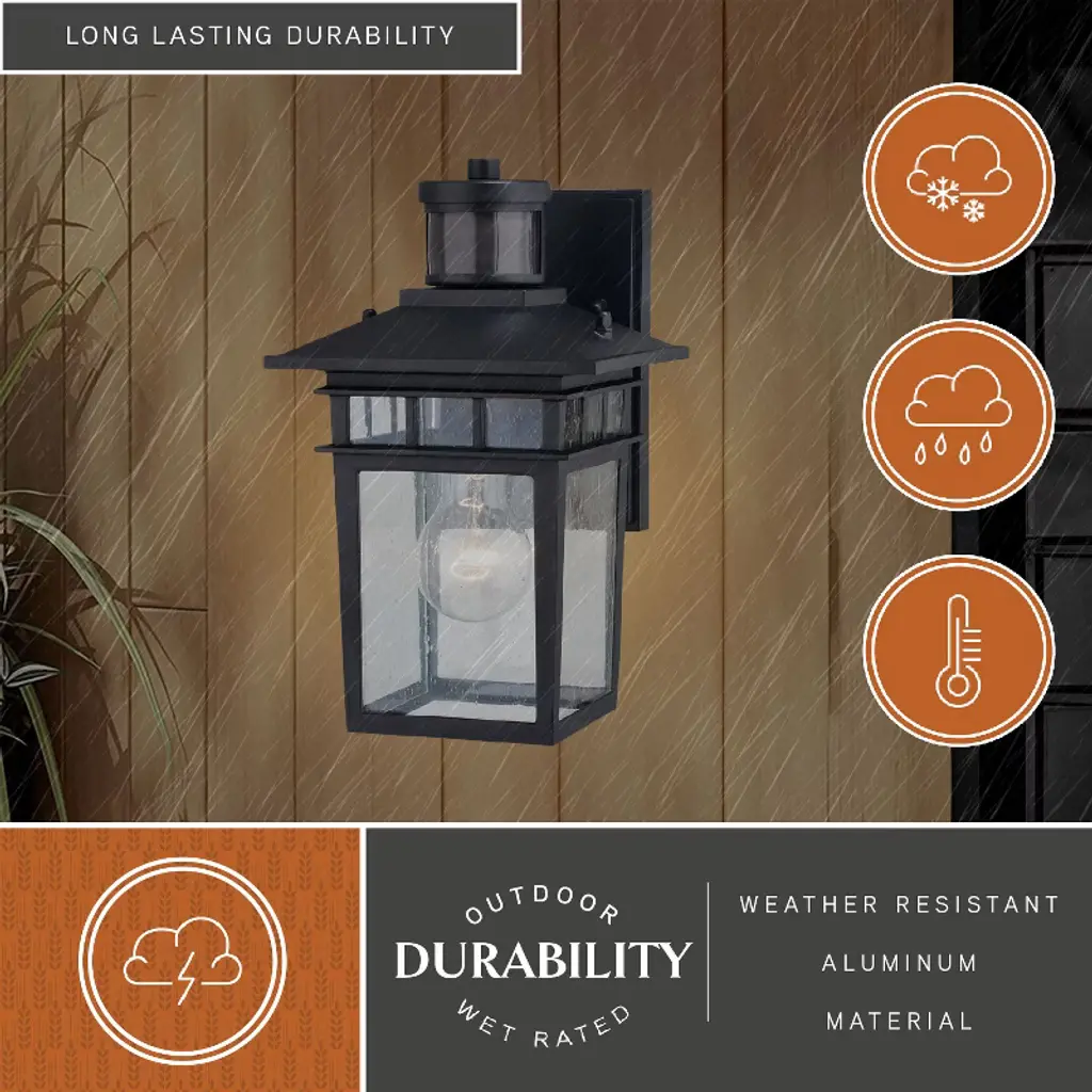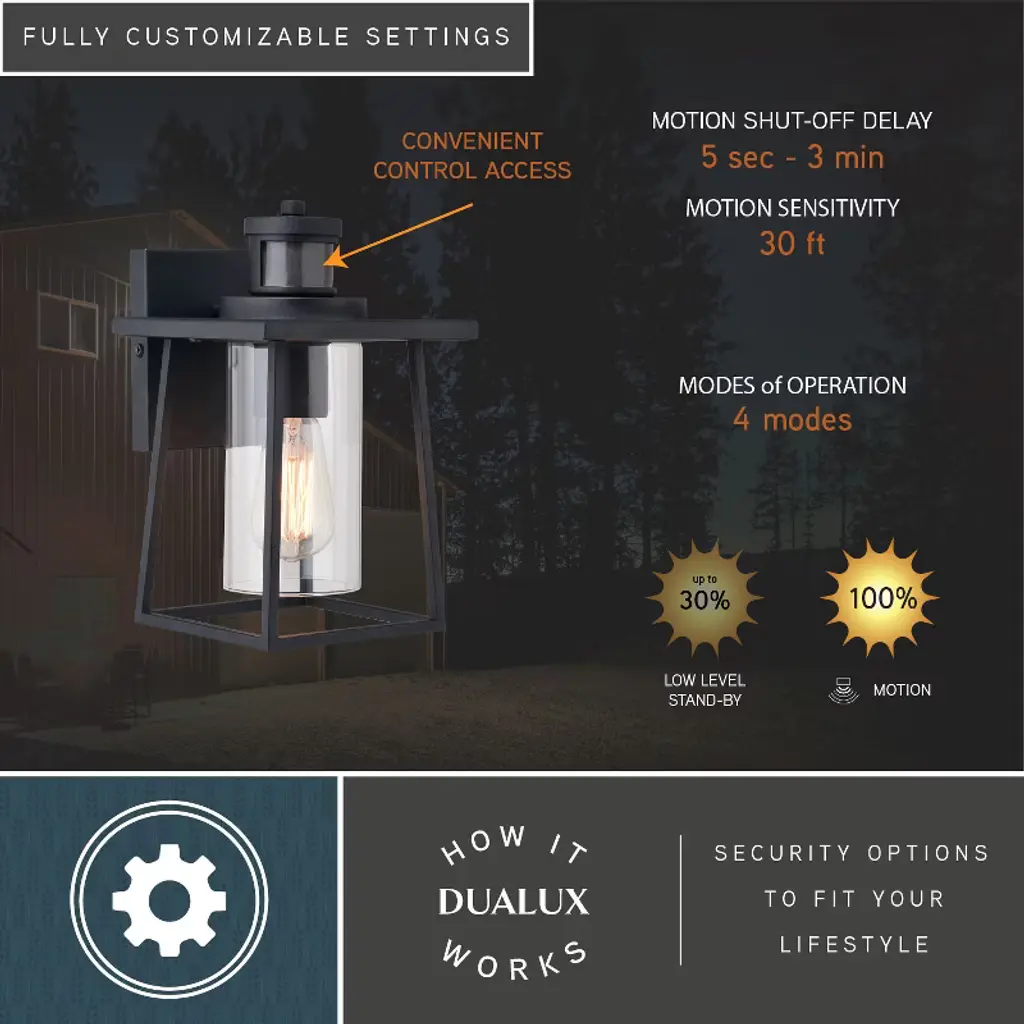 The Ridge collection with a textured black finish and clear seeded glass is modern mission styling at its best. Ideal for your porch, entryway, or any other outdoor area of your home. Dualux dual-level outdoor security lighting is designed to fit your lifestyle and enhance the beauty, safety, and usability of your home's exterior areas. Enjoy the comfort and convenience of automatic dusk-to-dawn lighting with low-level soft, ambient illumination overnight, fully brightening to high level whenever motion is detected to keep your property safe and secure. Standard on-off motion detection or full brightness dusk-to-dawn modes are also available via the EZSET controls. This fixture works with most dimmable LED bulb models. You get convenience, security, and efficiency of a security light integrated within a Dualux decorative outdoor light fixture.