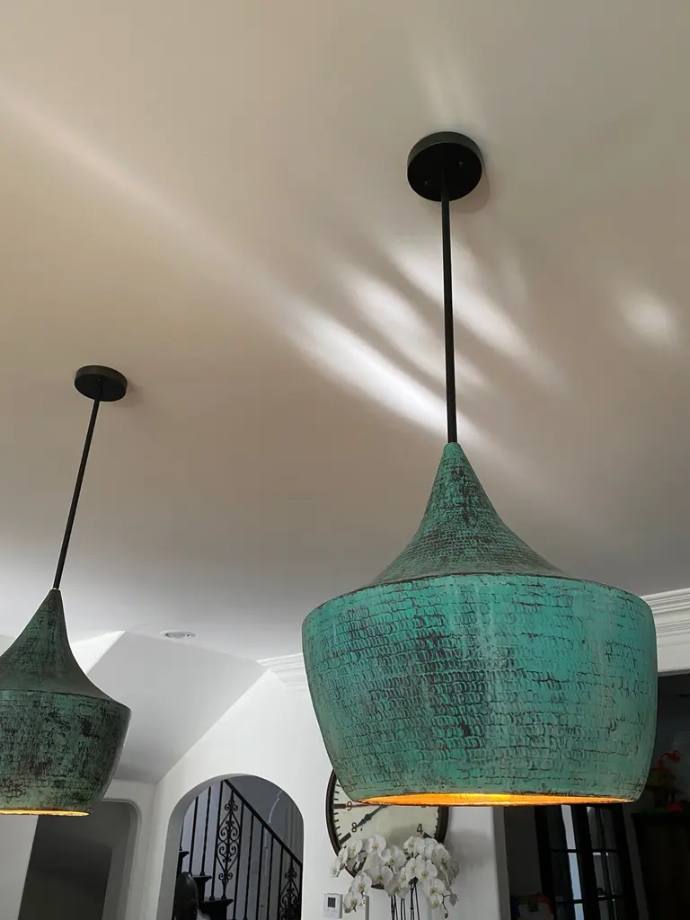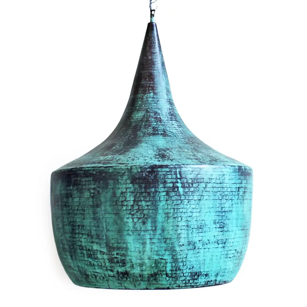 Hand pounded copper lantern with beautiful verdigris patina on the exterior with true copper finish on the interior. The copper and bulb reflection gives off a warm glow when turned on. Each handmade and beautifully unique with variations in finish and inherent differences. Includes 3’ hanging chain and black ceiling plate. 100 watt max fixture. Bulb not included.