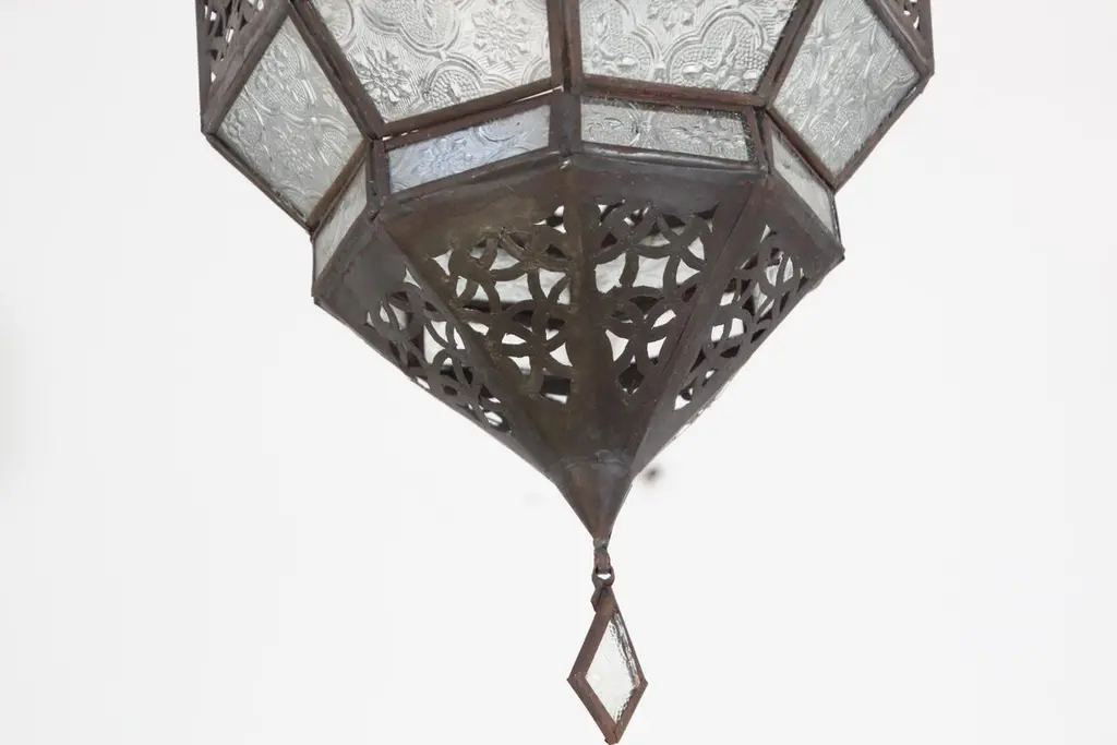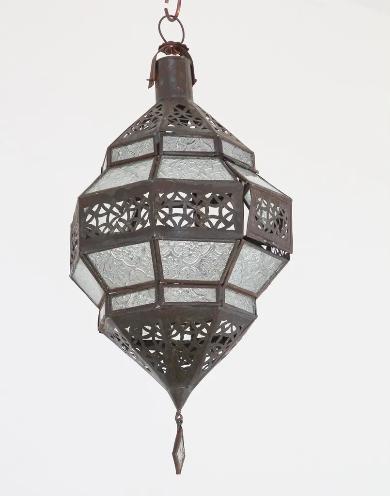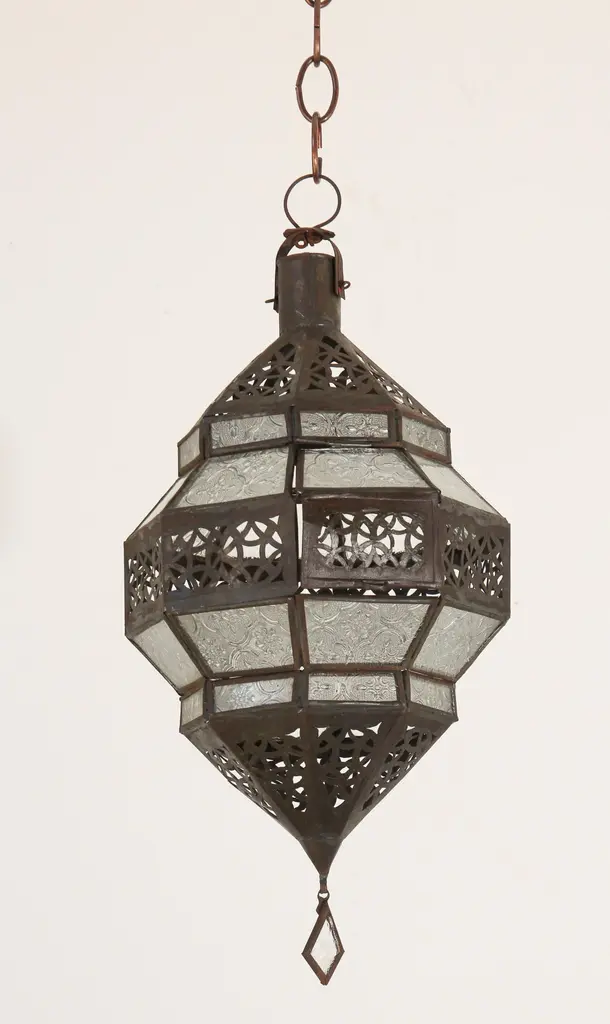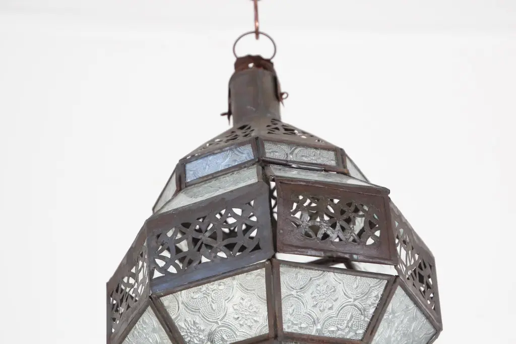 Moroccan metal and clear frosted glass lantern.Moroccan lantern in octagonal shape with rust color metal finish and clear glass.The top and bottom metal hand-cut in openwork Moorish design.This Moroccan lantern when lit will cast light on the walls with pretty patterns that will shadows on the ceiling and on the floor.The lantern has a small door to access the inside to use with candle or to be rewired.Use this lantern as a Moorish pendant, Moroccan hanging chandelier from the ceiling or from the wall as a wall sconce.Handcrafted in Marrakech, Morocco by skilled artisans,Size: 18 in. H x 8.5 in x 8.5 in. Hexagonal shape.from the top loop to the bottom of the finial 18"Glass shade 12" height x 8" wide.It is not wired for electricity.For indoor or covered area use only.