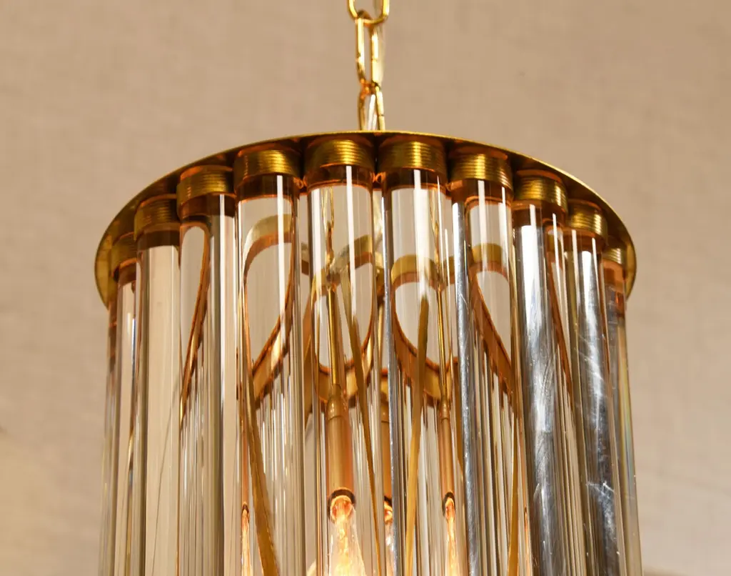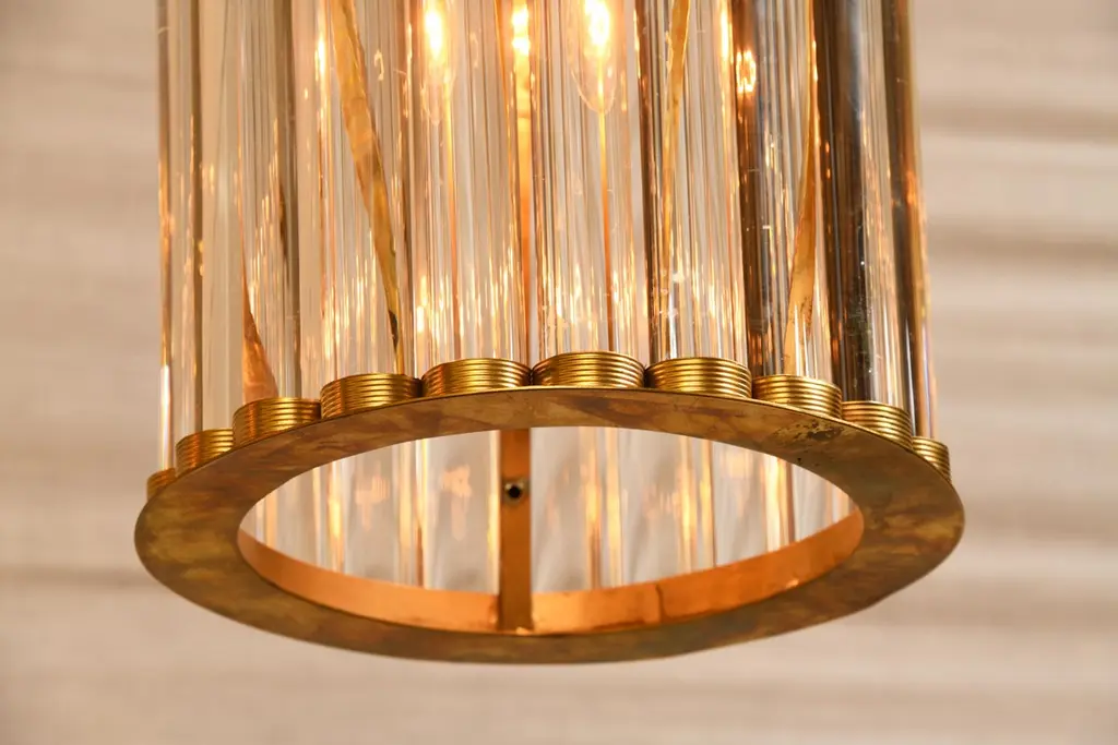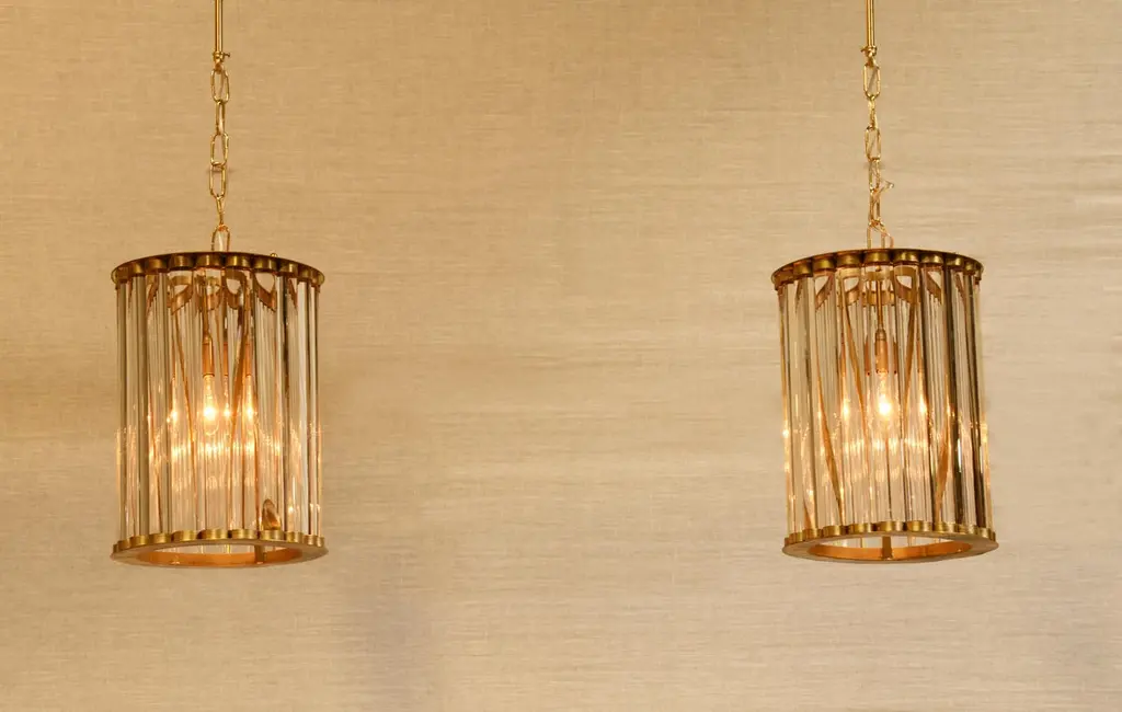 What a delight! This is the original—thick, solid lens-like glass and solid brass detailing create a heavy, large-scale lantern; hang one or a pair!Thomas Cooper Studio represents a multilayered, multifaceted collaboration, where materials and techniques join forces in a search for the inner poetry of each piece: heat-formed, mouth-blown, flash-cracked glass; carved marble, alabaster, and natural stone; cast and hand-patinaed bronze; hand-polished, leaded crystal. At the same time, a study of sculptural expression creates a balance between shine and shade, density and delicacy, form and function.