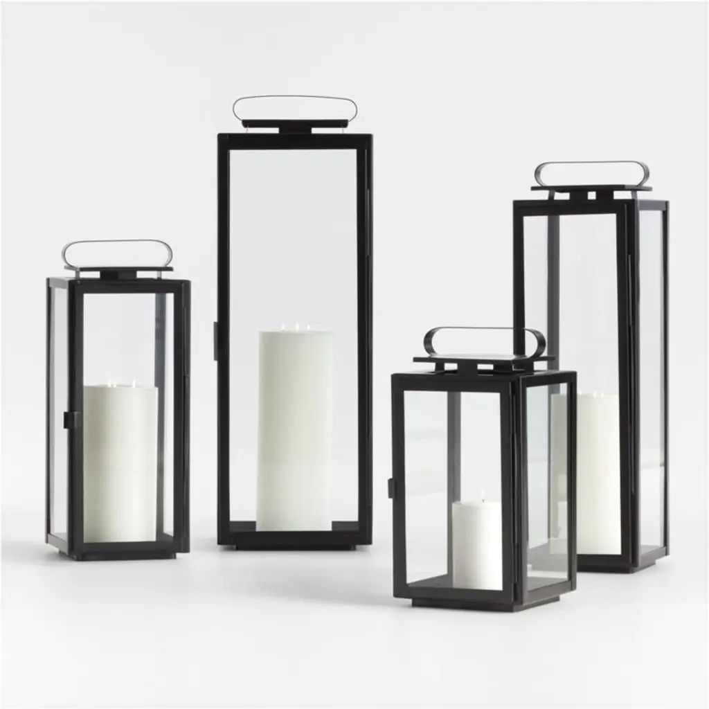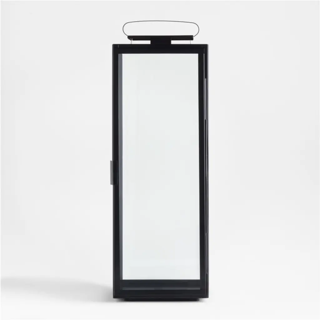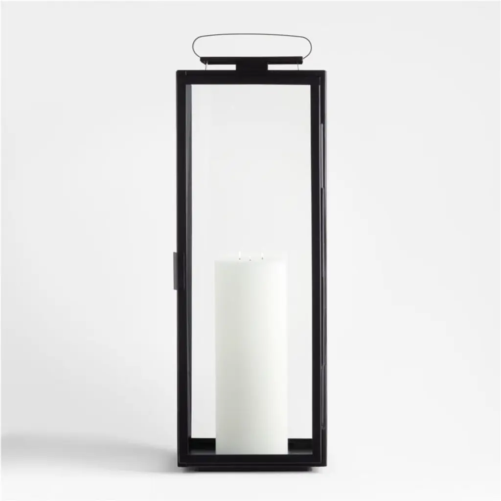 The classic black iron lantern goes geometric in Walker. Panes of glass outlined in crisp black iron frames protect pillar candles from breezes and air currents. An oblong handle offers curved contrast to the extra-large, clean-lined lantern. Place one on either side of the fireplace mantel or group with our smaller Walker lanterns for a dramatic candlelight display.