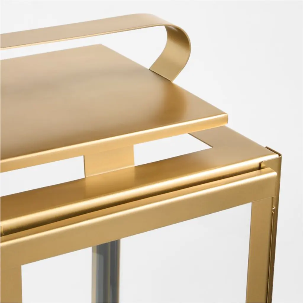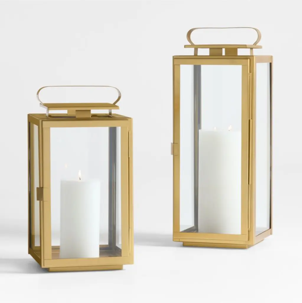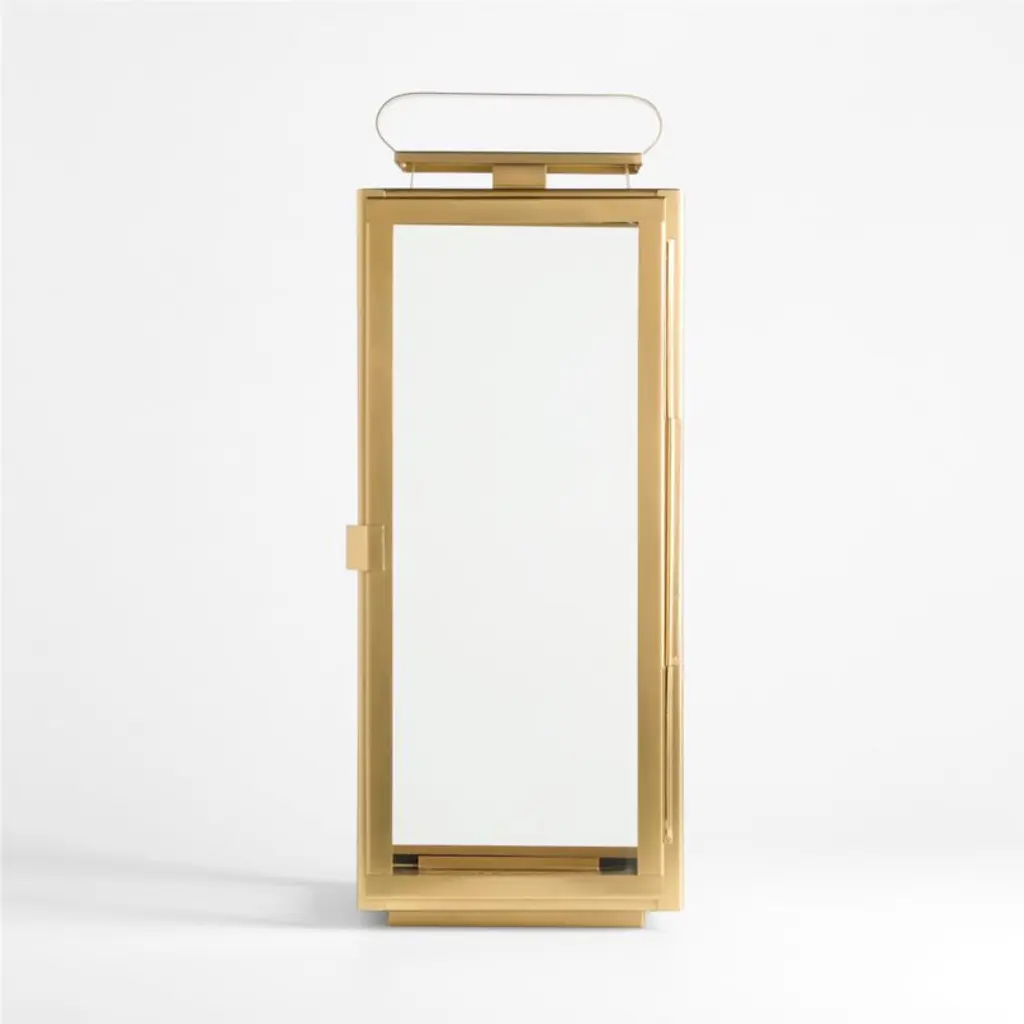 The classic iron lantern goes geometric and glam. A gleaming brass finish gives our bestselling Walker lantern the warm look of an heirloom. Panes of glass outlined in crisp golden frames protect pillar candles from breezes and air currents. An oblong handle offers curved contrast to the clean-lined lantern. Place one on either side of the fireplace mantel or group with our smaller Walker lanterns for a dramatic candlelight display on the patio.