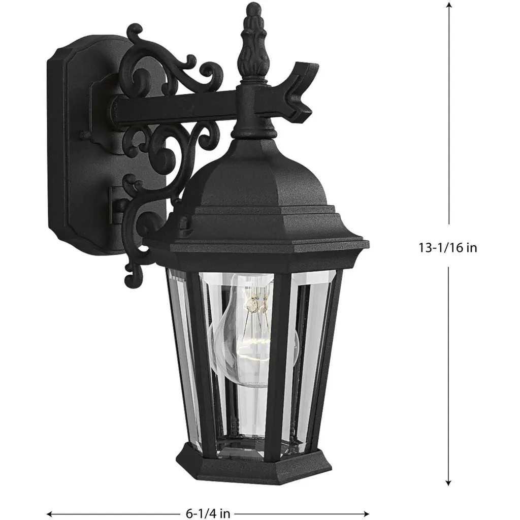 The Welbourne collection features hexagonal framework with vine inspired scrolls and clear beveled glass panels. Cast aluminum construction with durable powder coat finish. One-light 6-1/2" top mount outdoor wall lantern.