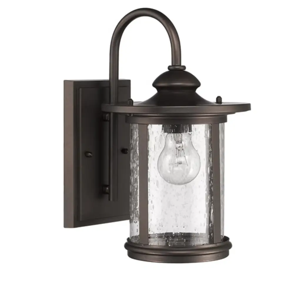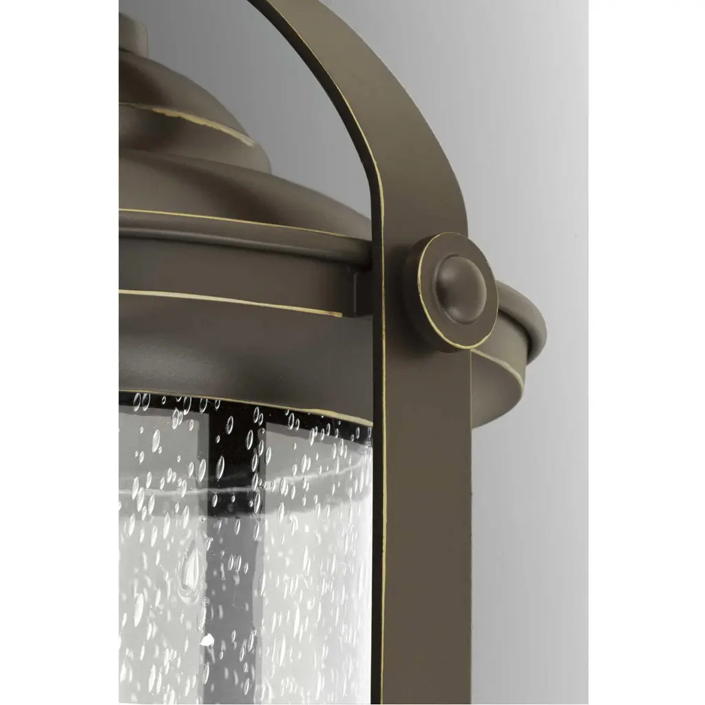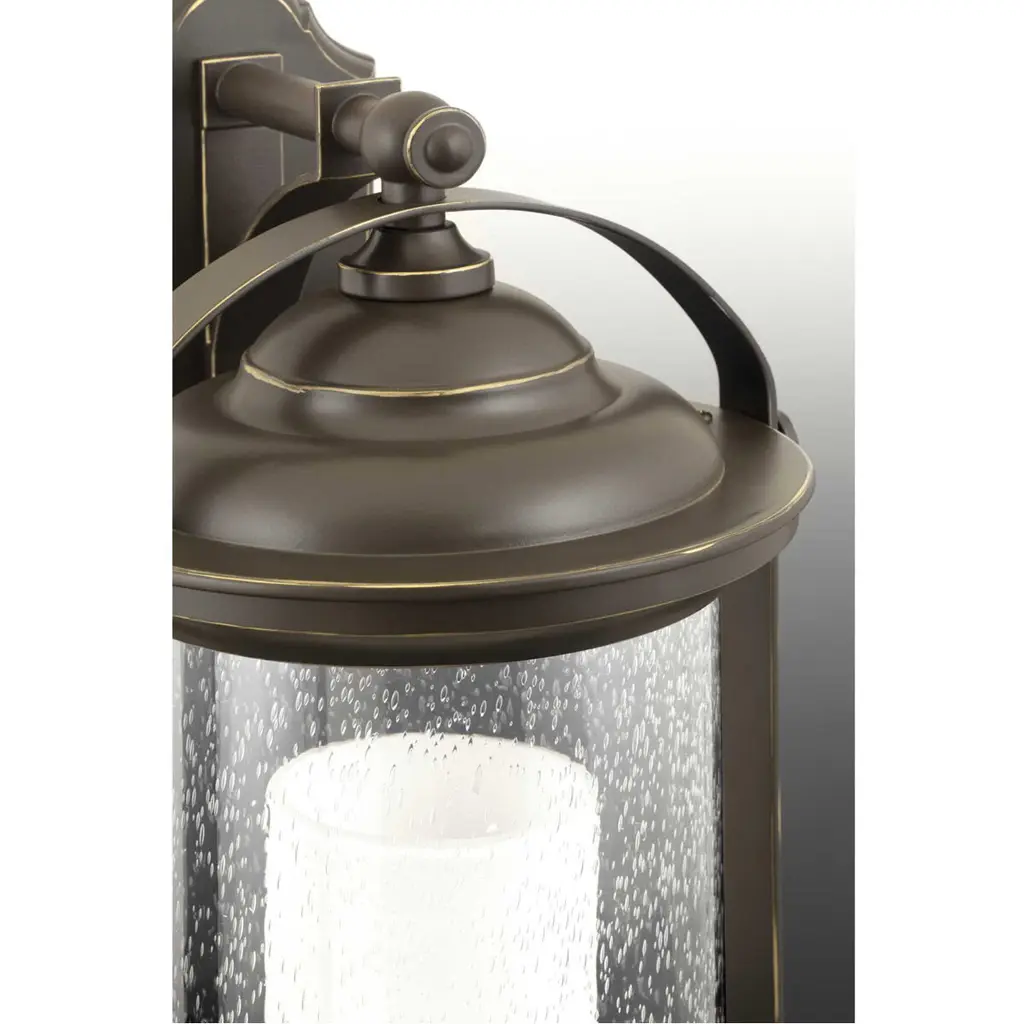 Inspired by traditional lantern styles, Whitacre medium wall lantern incorporates handsome details. Clear seeded glass surrounds an etched opal glass candle diffuser. An Antique Bronze finish complements a variety of exteriors, including Transitional and Traditional and Farmhouse designs.