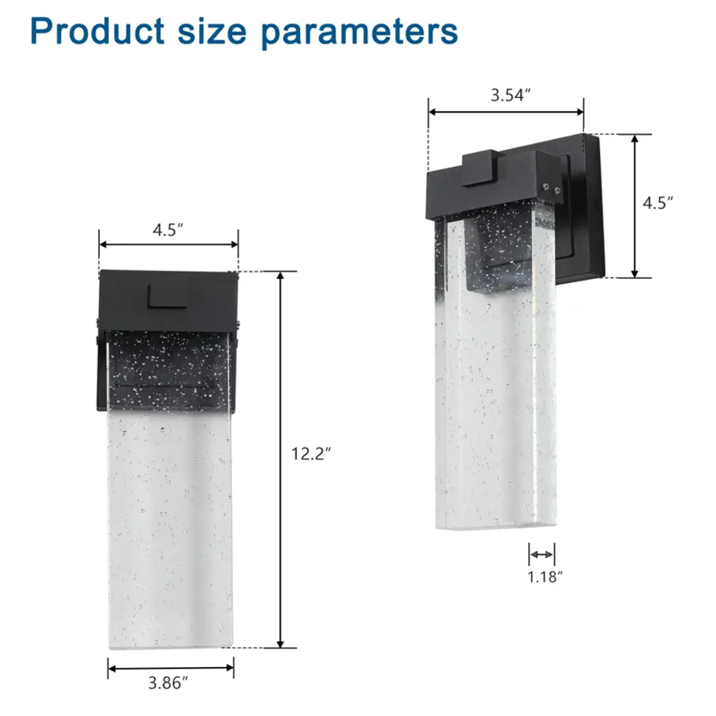 Elevate your outdoor space with these modern 12"H outdoor wall lanterns. Featuring a sleek black die-cast aluminum body and transparent LED crystal glass, these lanterns create a stunning visual effect with their sparkling light. Perfect for doorways, patios, garages, and walkways, they add a touch of contemporary elegance to any setting. The waterproof design ensures durability in all weather conditions, while the open-bottom structure simplifies installation and maintenance. Supporting multiple types of light bulbs (12W per lamp), these versatile fixtures are both functional and stylish. Ideal for enhancing curb appeal and creating a warm, inviting atmosphere.