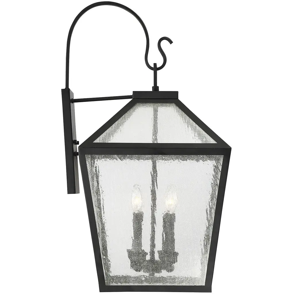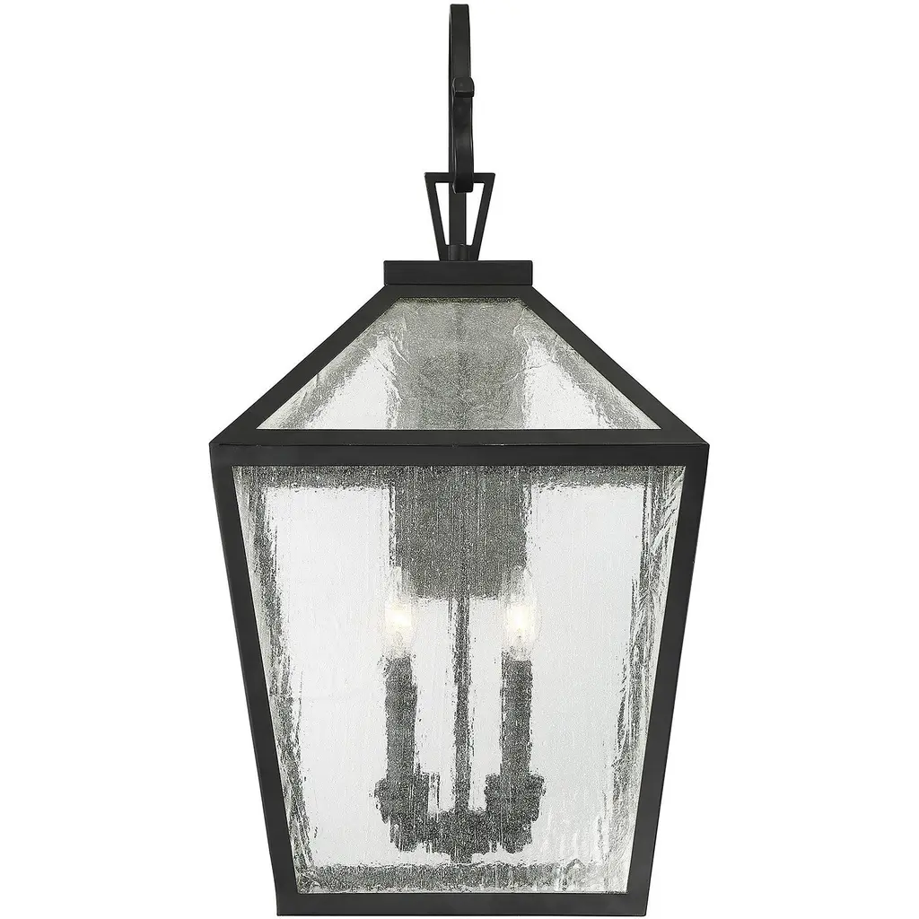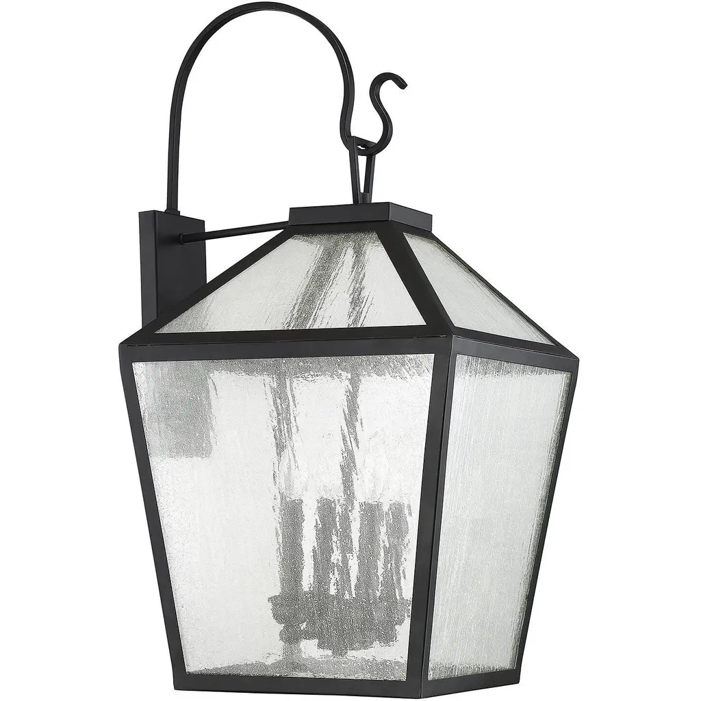 The traditional charm of vintage lanterns blends beautifully with streamlined, contemporary appeal in this Savoy House Woodstock 4-light outdoor wall lantern. Everyone who enters your home will feel welcomed and appreciate its classic style. Finished in matte black with clear seeded glass panes that add wonderful textural interest. The 30.5" high by 15" wide size makes it easy to place multiples of these lanterns on the walls of your porch, patio, sunroom, garage or pergola. Uses 4 candelabra size bulbs of up to 60 watts each. Wet area rated.