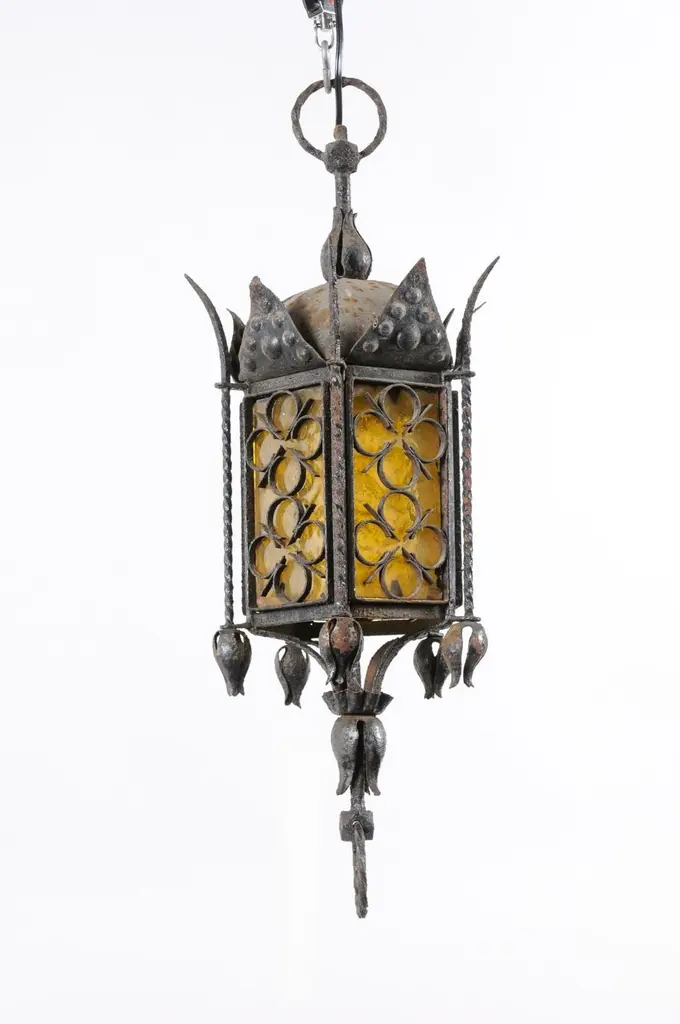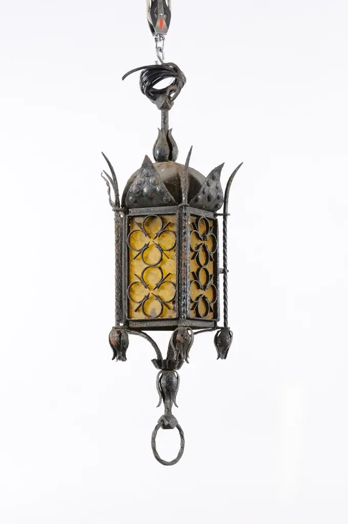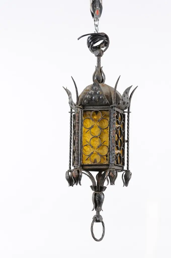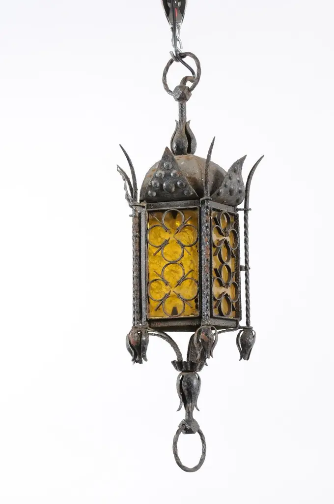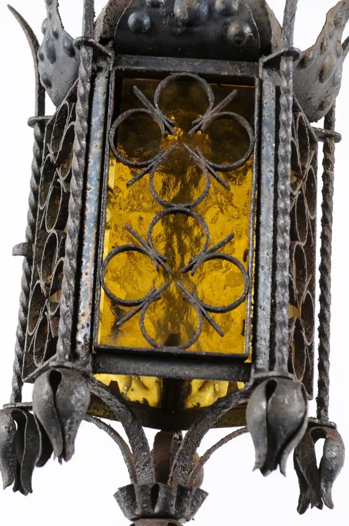 Set of 3 Wrought Iron Hanging Lanterns with Amber Glass, Italy late 19th Century. PRICE PER EACH.