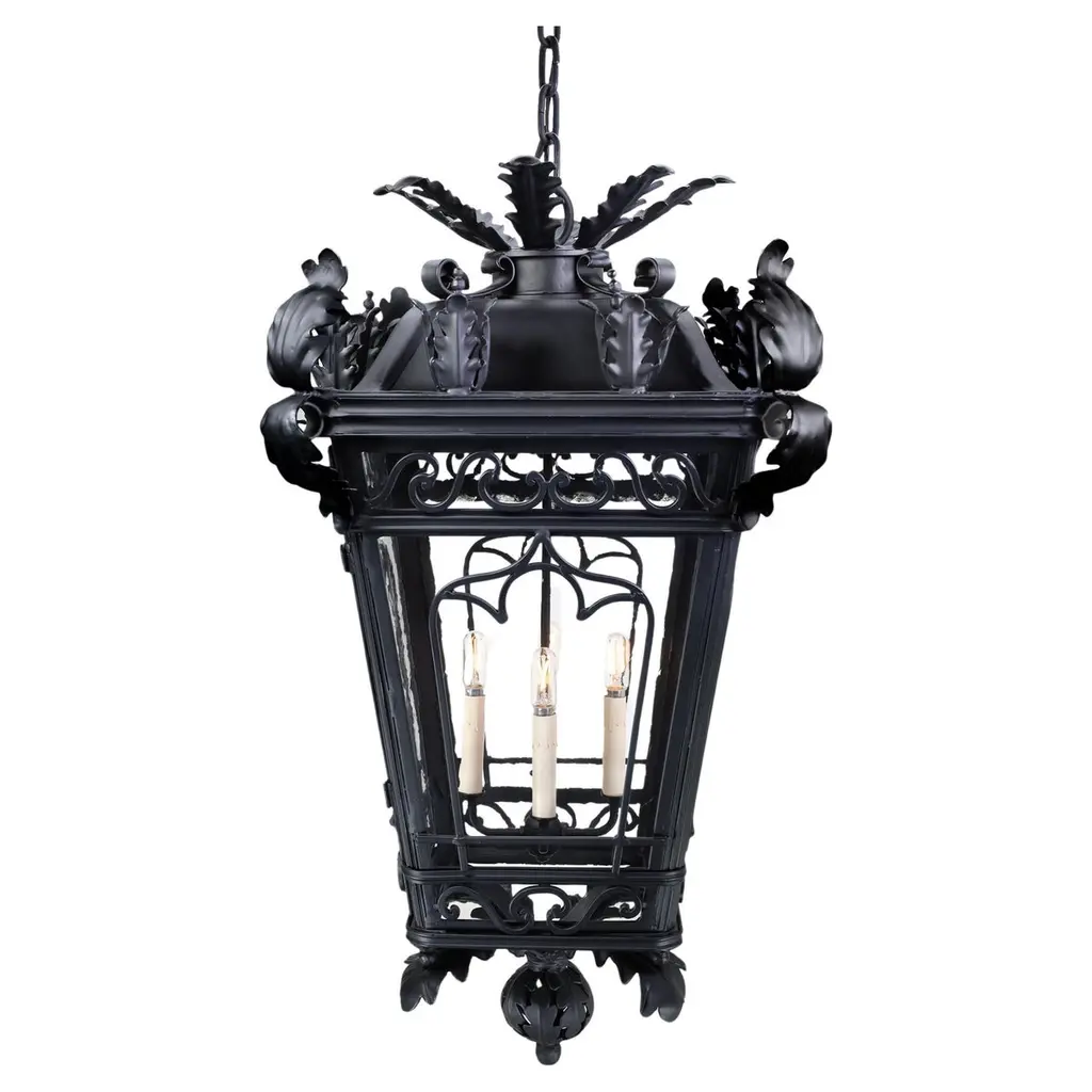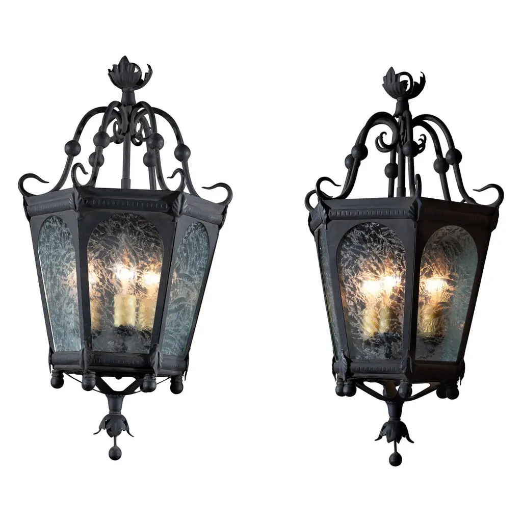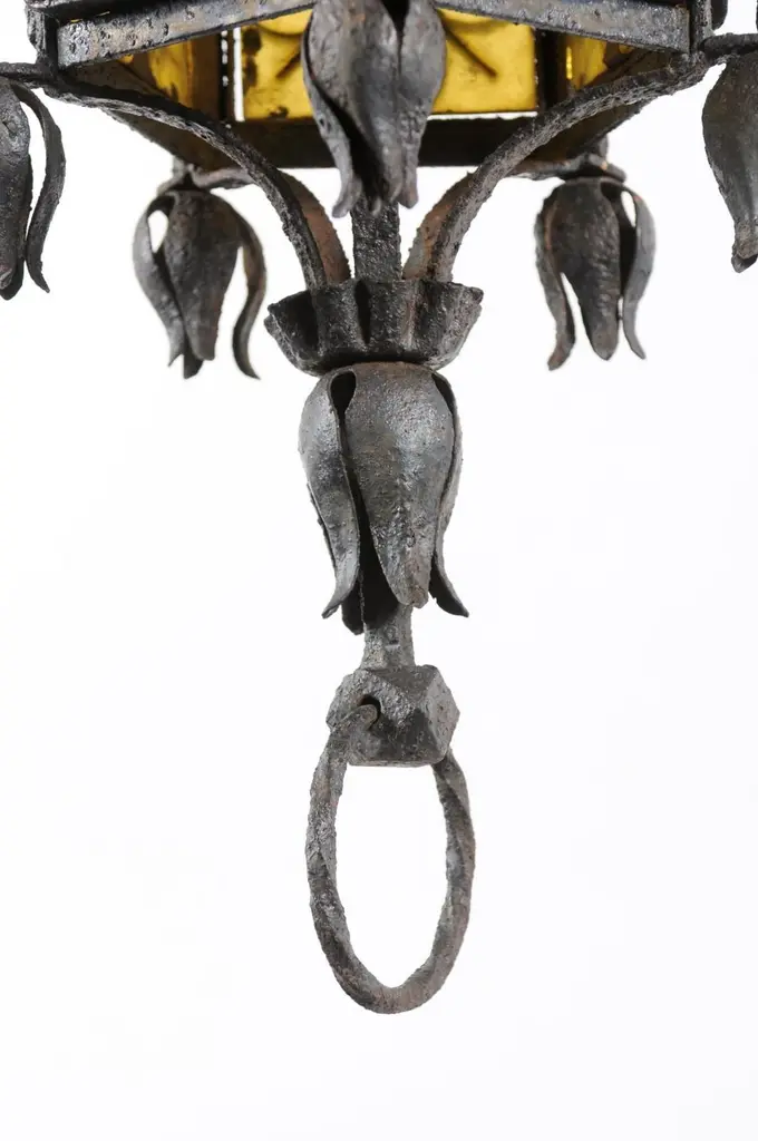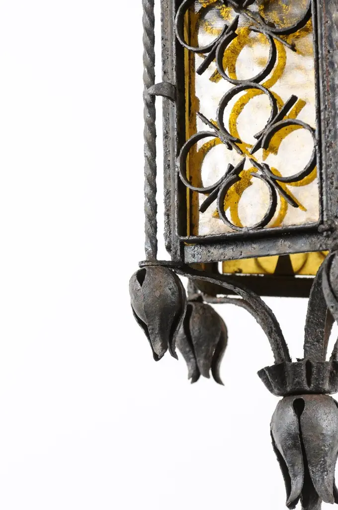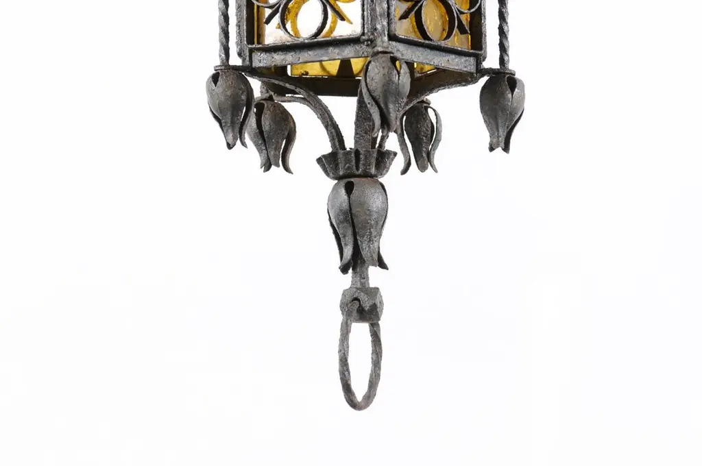 Set of 3 Wrought Iron Hanging Lanterns with Amber Glass, Italy late 19th Century. PRICE PER EACH.