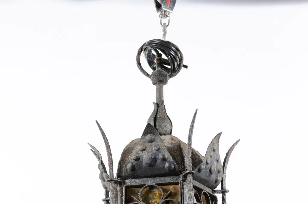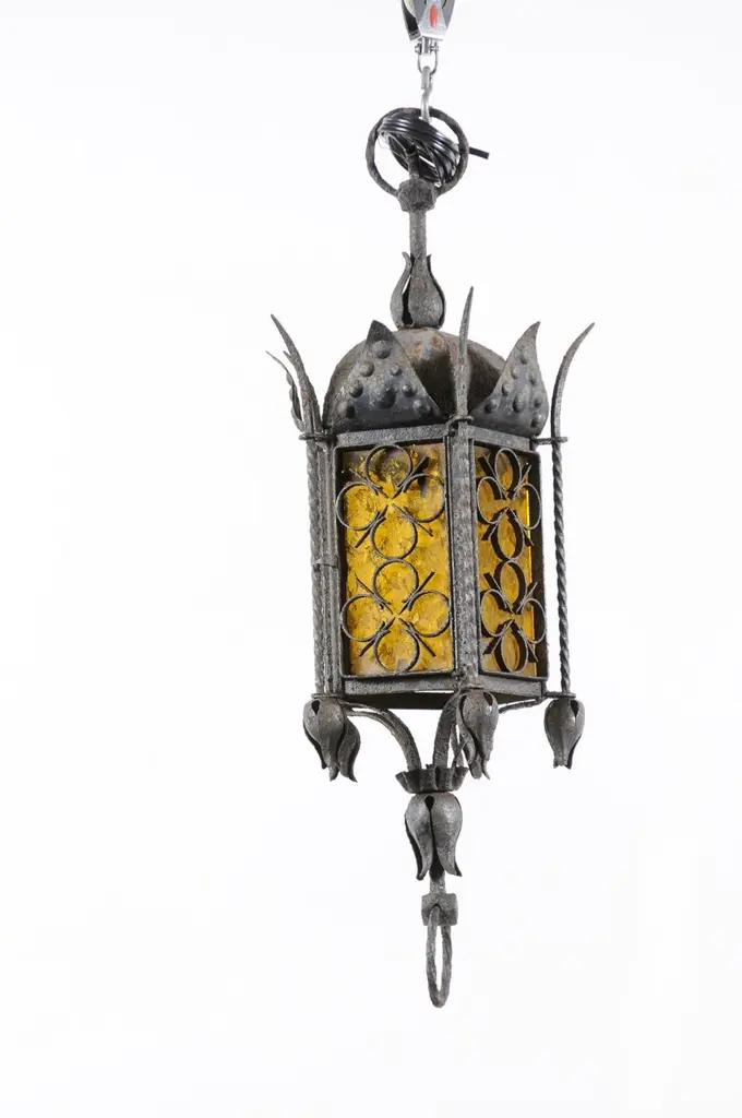 Wrought Iron Hanging Lanterns With Amber Glass, Set Of 3, Price Per Each