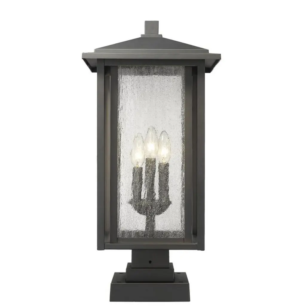 The best of modern and traditional converge in the classic design of this three-light outdoor pier mounted fixture. Gorgeous oil rubbed bronze provides the perfect finish for an aluminium dual frame and a candelabra-style bulb mount shielded by a romantic seedy glass shade. Outdoor Living/Deck/Patio Shade Included: Yes Dimmable: Yes Material: Aluminum, Finish Color: Black, Width: 11", Height: 23.5", Length: 11", Fitter Size: 3 Inch", Lamping Type: Incandescent, Number Of Bulbs: 3, Wattage: 60 Watts, Dimmable: Yes, Moisture Rating: Wet Rated