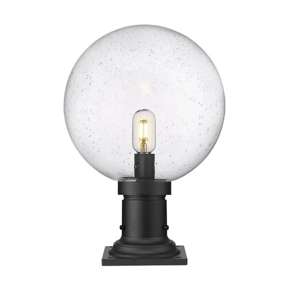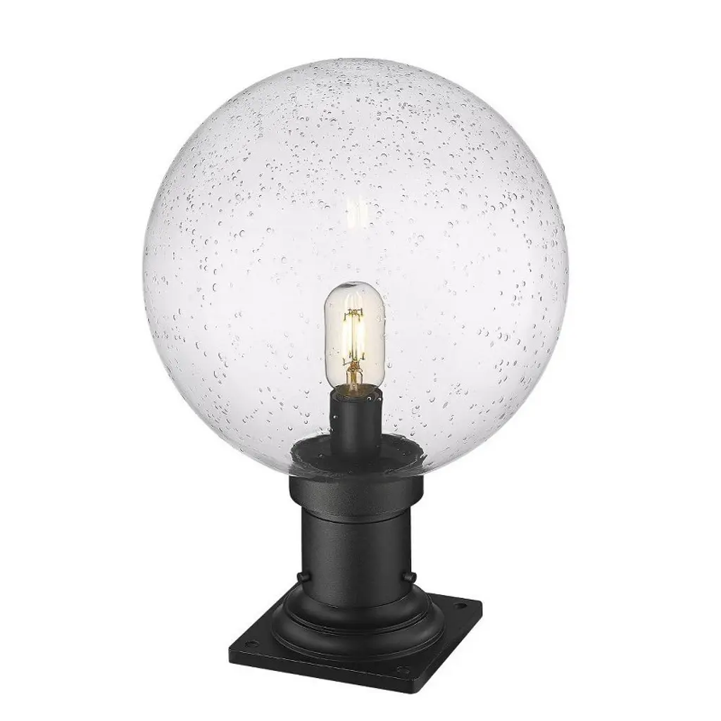 Embellish the design aesthetic in a yard space or deck with a classic light source. From the Laurent collection comes a one-light outdoor pier mounted fixture delivering no shortage of personality and a quaint look ideal for gardens and walkways. This light fixture features construction of versatile black finish aluminum and is topped with a delicate clear seedy glass globe.