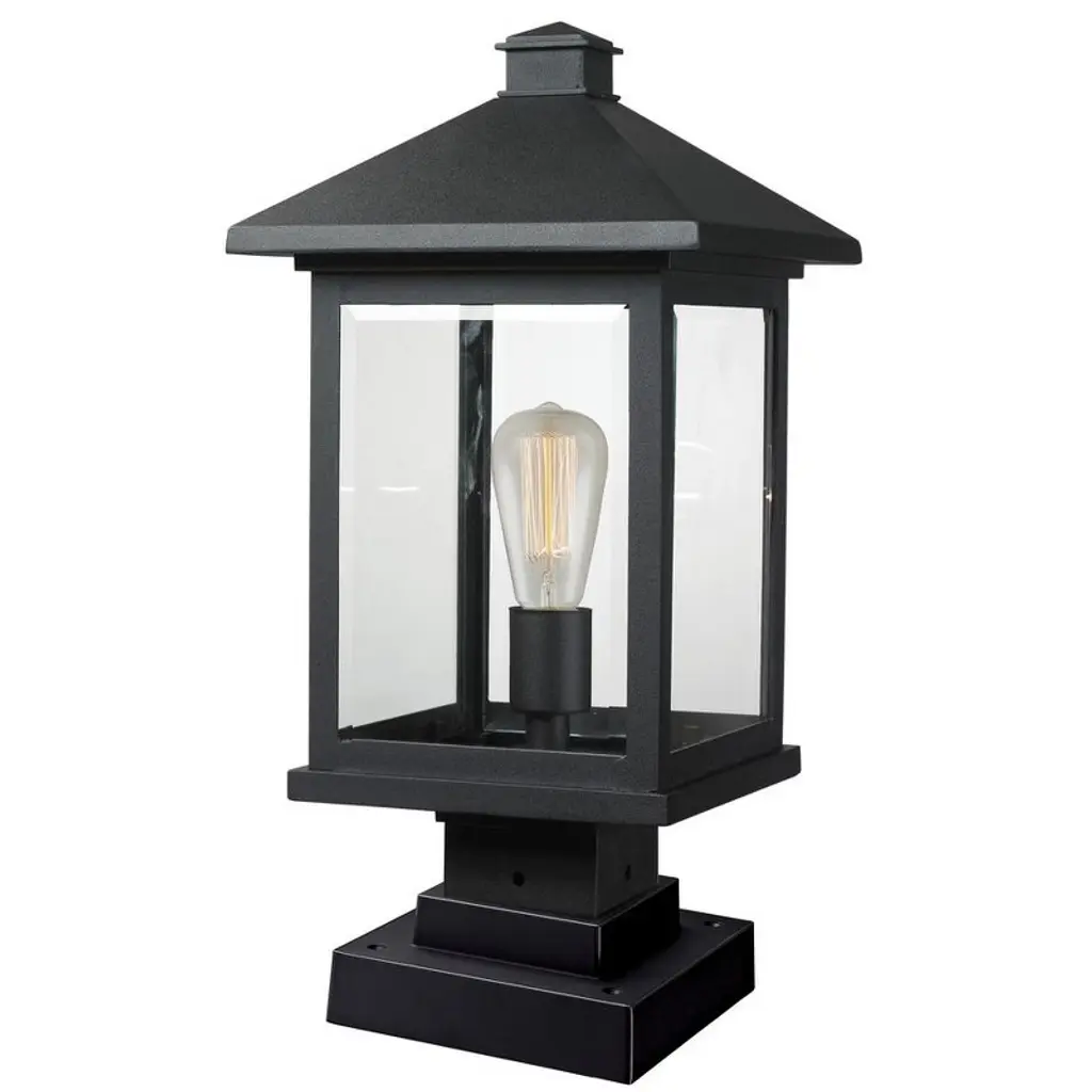 The timeless, mission styling of the Portland family displays clean lines to suit both contemporary and traditional decors. Clear beveled glass paired with black comprised of cast aluminum which withstands natures seasonal elements. Room Recommendation: Outdoor Living/Deck/Patio Dimmable: Yes Shade Included: Yes Material: Aluminum, Finish Color: Black, Width: 9.5", Height: 20.5", Fitter Size: 3 Inch", Lamping Type: Incandescent, Number Of Bulbs: 1, Wattage: 100 Watts, Dimmable: Yes, Moisture Rating: Wet Rated