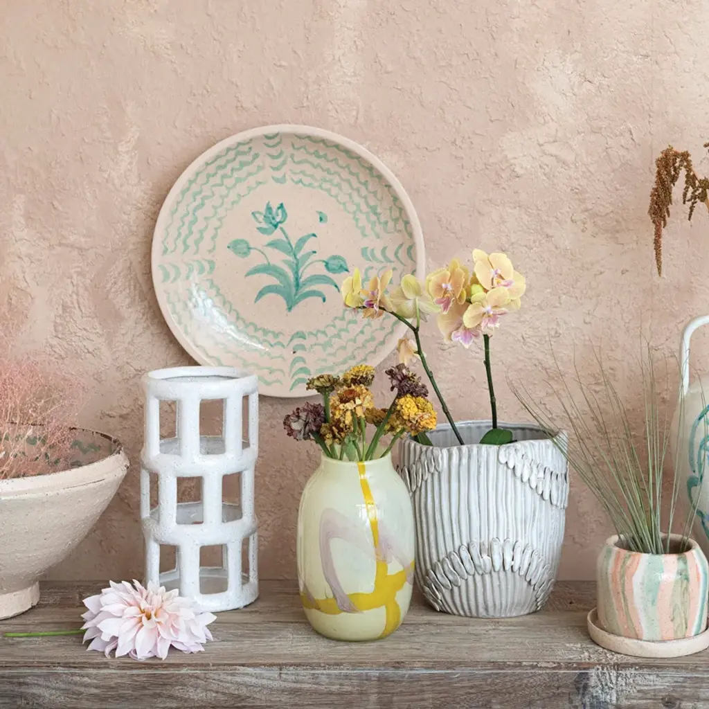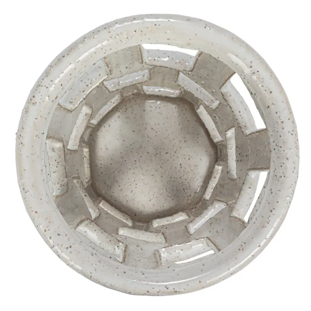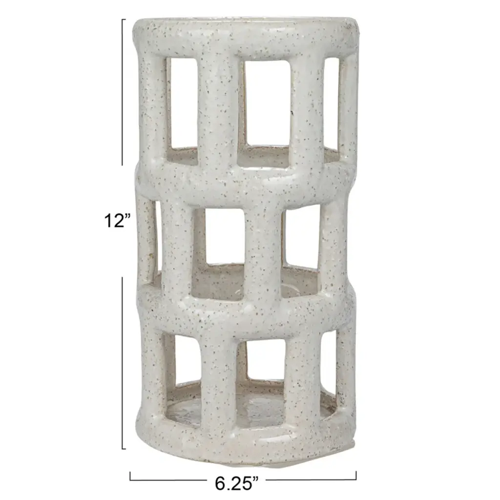 This decorative stoneware lantern candle holder with cut-outs, and white is a stunning and warm piece for any home. It consists of a round base and a cylindrical body that features a stoneware construction and a cut-out design. The stoneware construction is durable and heat-resistant, which makes this lantern candle holder last for a long time. The cut-out design creates a beautiful and cozy effect that allows the light to shine through and cast shadows on the walls. The white color adds a touch of elegance and simplicity to this lantern candle holder. It is perfect for holding and displaying candles, tea lights, or fairy lights in the living room, bedroom, or patio. It can also be used as a decorative accent on a shelf, table, or mantel. This lantern candle holder is easy to clean and maintain, and it will enhance any space with its beauty and warmth. It measures 6.25 inches in diameter and 12 inches in height, making it suitable for any space. This decorative stoneware lantern candle holder with cut-outs, white is a must-have for anyone who loves style and coziness.