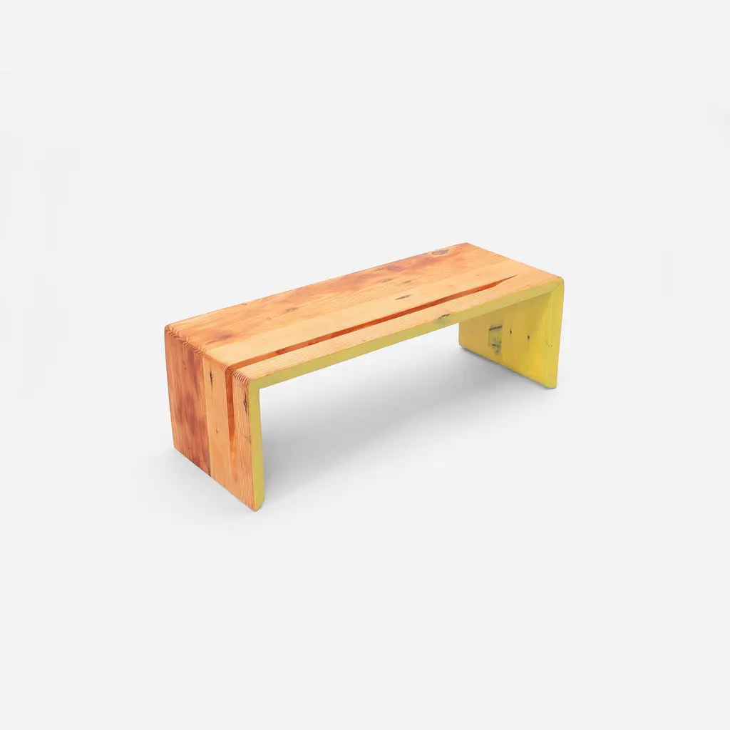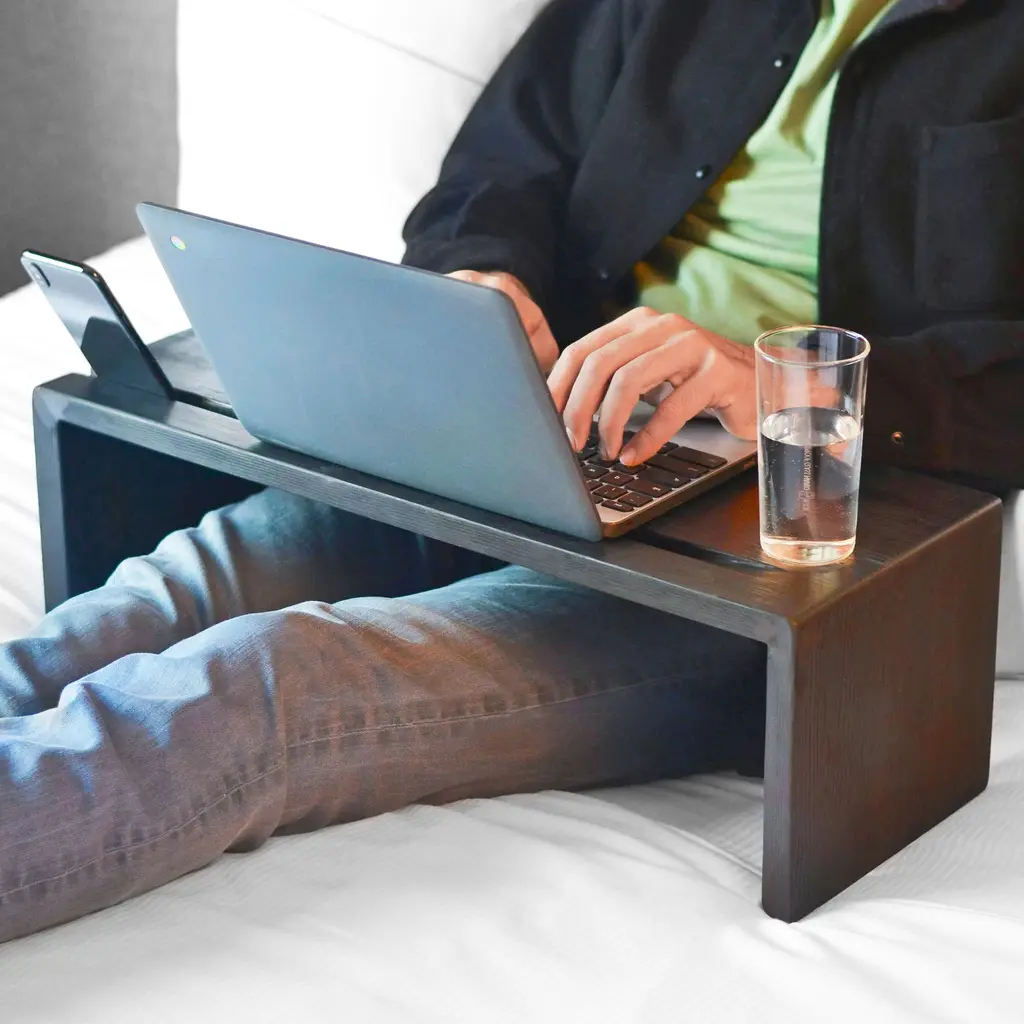 Made from repurposed construction debris. Large surface holds a laptop, book and drink. Grooved detail props up phones or tablets. Doubles as a side table when placed on its side.