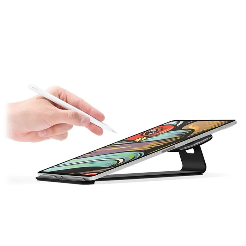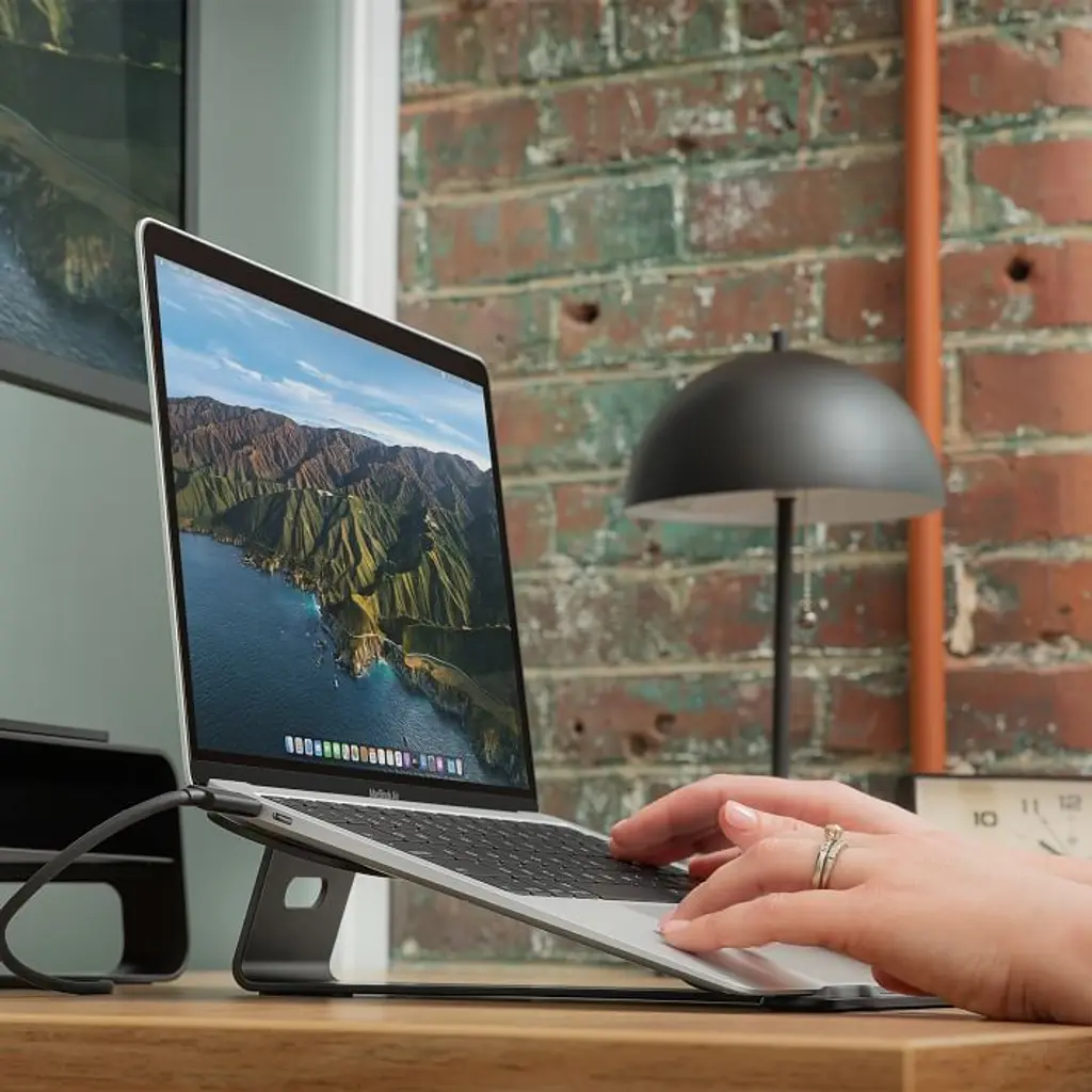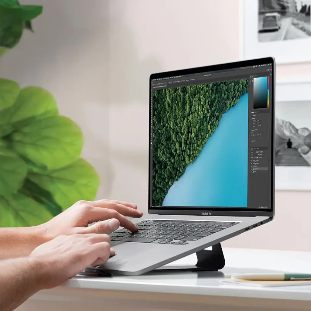 9"w x 10"d x 2.8"h. Aluminum stand in a Black finish. Compatible with MacBook Pro and iPad. Sold individually. Made in China.