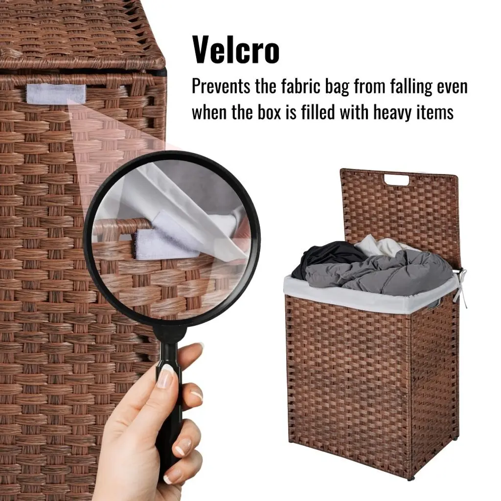 LAUNDRY HAMPER WITH LID - Your companion in every space in your family from the laundry area, bathroom or bedroom. More creatively, it can also be used as a multi-purpose storage box for household items such as children's toys, mattresses, pillows, blankets or swimming pool equipments.SATISFIED IN EVERY DETAIL - With research and improvements, our clothes hamper is equipped with velcros on both sides of the clothes hamper to ensure the hamper bags do not fall when filled with clothes. Instead of using a closed lid, our product is equipped with a handle hole for convenient use.PREMIUM MATERIALs - Laundry organizer is designed in knock-down form to save space when not in use. Made of eco-friendly plastic rattan wicker with unique natural-looking patterns, the durable powder-coated steel frame comes with two washable and removable laundry bags made from 200gsm soft canvas. There is a one-compartment bag and a two-compartment bag for easy classification of clothes.WHY NEED A LAUNDRY BASKET? - Optimizing usable space is always a top factor for small and medium sized homes, using storage baskets is the optimal choice to help the home space look tidy, neat and scientific. In particular, using a laundry basket also helps you easily classify white and colored clothes to save time when washing.WHAT WILL YOU GET? - A laundry basket set includes - 01 laundry basket with lid 18 inch length x 13.5 inch width x 24 inch height with loading capacity at 100 L ~ 26.4 Gallon ; 02 laundry bags with one compartment; clear installation instructions.