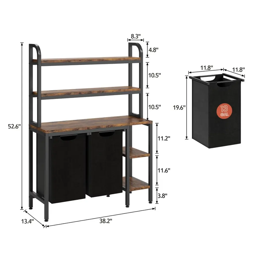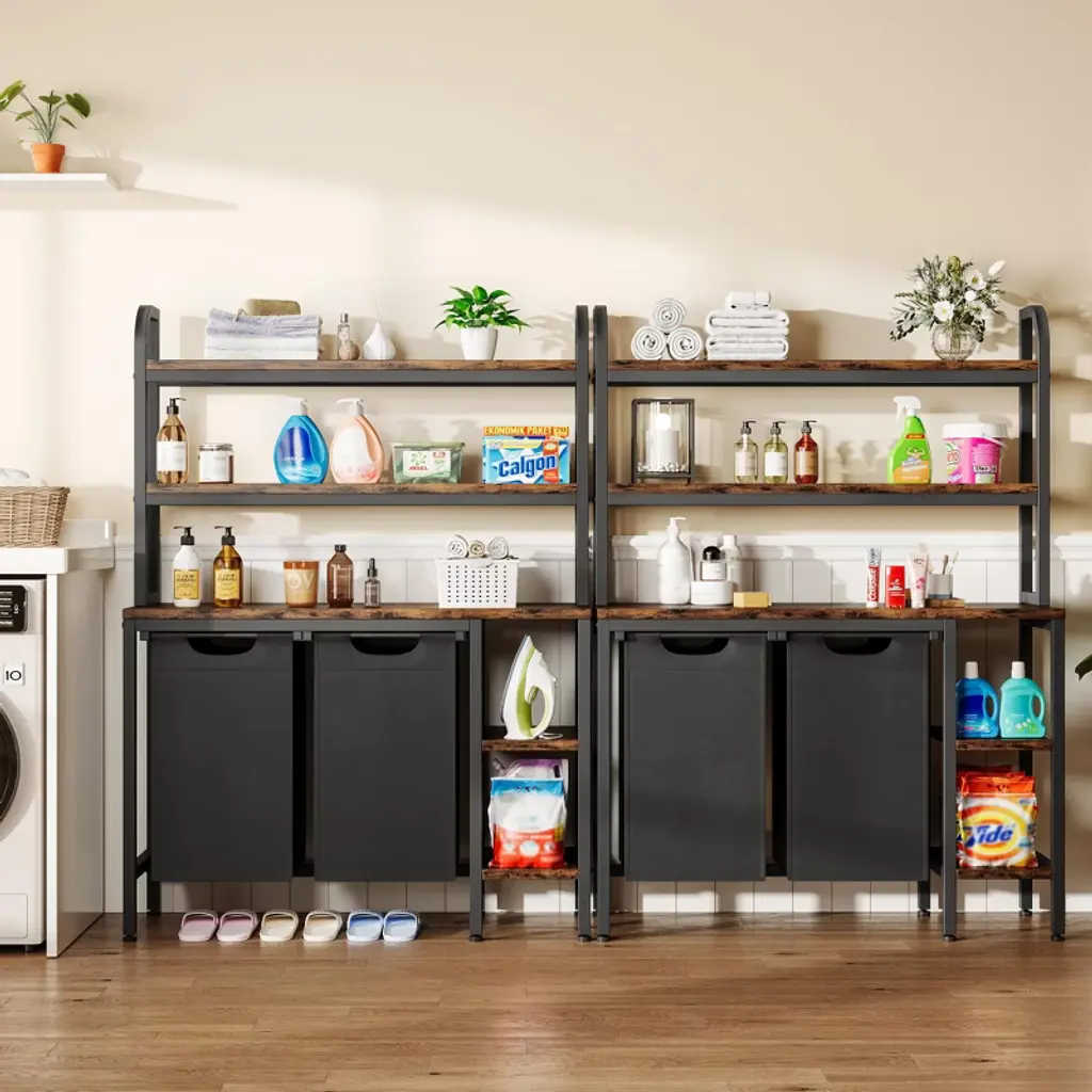 This multi-functional laundry basket features a dual-compartment design with overall dimensions of 38.2 inches long ¡Á 13.4 inches wide ¡Á 52.6 inches high. It includes two 13-gallon removable Oxford fabric laundry bags, enabling sorting by color, fabric type, or family member. The three-tier main storage rack and side shelves accommodate laundry detergent, towels, and other essentials, while the central platform doubles as an ironing area. The sturdy combination of metal frame and wooden panels includes adjustable feet for uneven surfaces. Assembly takes just 30 minutes following the instructions, efficiently addressing laundry sorting and home storage needs.