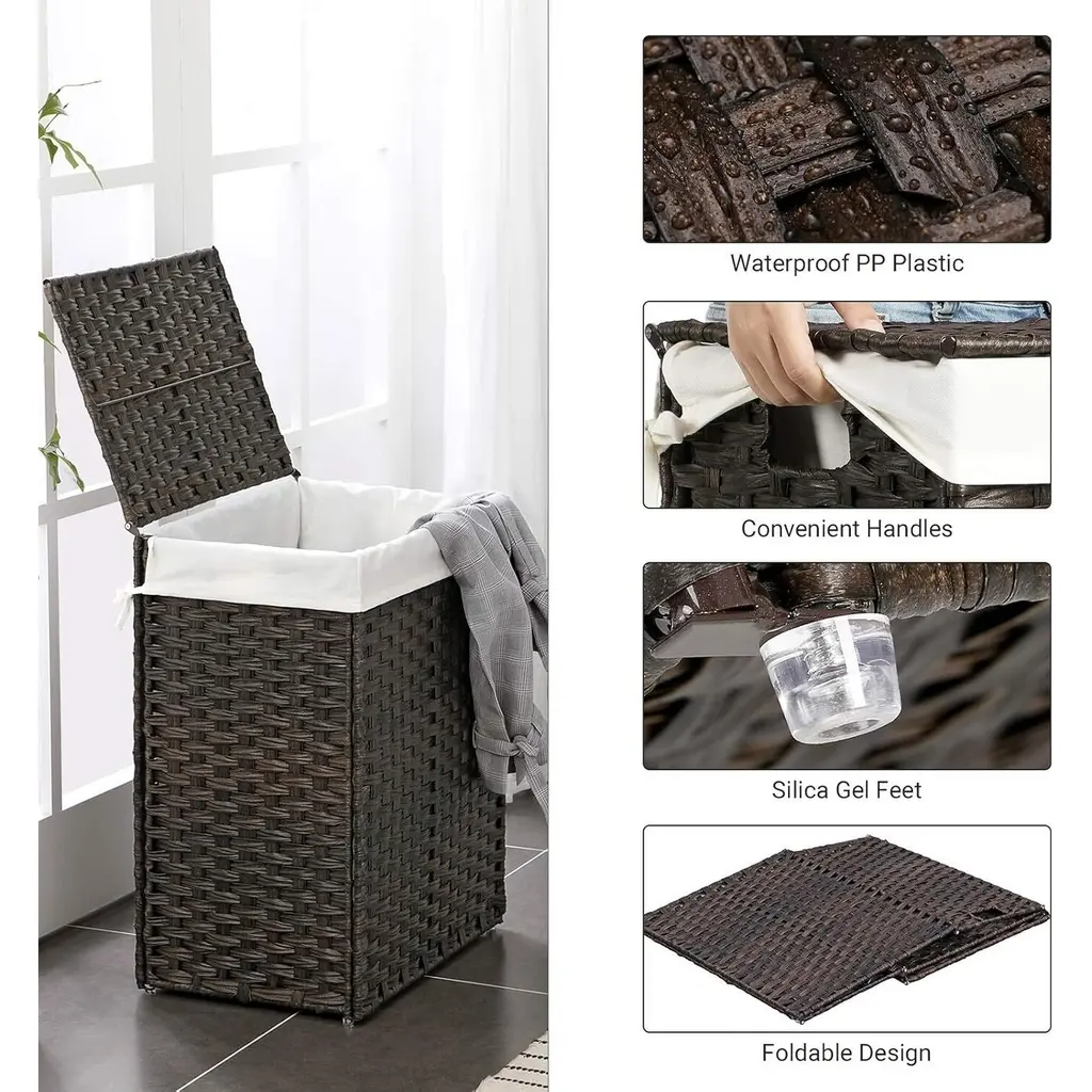 1 x Laundry Basket 1 x Accessory Bag 1 x Instructions Elegant Look: The handwoven design looks elegant and eye-catching. Breathable Synthetic Rattan: It keeps your clothes dry and fresh. With Lid: It hides your laundry and prevents the smell from wafting out. Ideal Size: It fits perfectly in small spaces and is roomy for your laundry. Washable Liner: You can remove the liner easily and wash it in the washer. Sturdy and Durable: Supported by a sturdy steel frame, it’ll last for years. 4 Silica Gel Feet: They protect your floor from scratches. Collapsible: You can fold it flat when it’s not being used for easy storage. 【LAUNDRY HAMPER WITH LID】The lid, which is easy to open with a single hand, hides your dirty laundry out of sight, helps contain unpleasant smells, and keeps your pets out of the laundry. 【PERFECT SIZE FOR TIGHT SPACES】This 18.1"L x 13"W x 23.6"H laundry basket offers 23.8 gallons (90 L) of laundry storage yet occupies a small footprint to fit in small spaces of your bathroom, bedroom, or laundry room. 【REMOVABLE LINER WITH HANDLES】The removable liner is machine-washable for good hygiene. And the liner comes with 2 handles on the sides, which makes it easy to carry to wherever you need. 【WATERPROOF, VENTILATED & STURDY】The breathable, waterproof PP rattan helps your clothes stay dry and well-ventilated while the sturdy metal frame makes this hamper robust enough to hold up to 55 lb. 【PORTABLE, FLOOR-FRIENDLY & FOLDABLE】Cut-out handles make the laundry basket easy to move. The bottom feet ensure your floor won’t get scratched while the foldable design allows for easy storage when not in use.