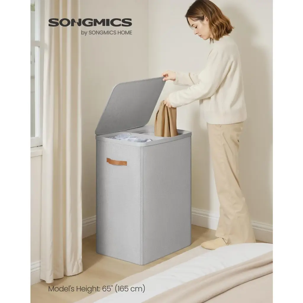 This 44.9-gallon laundry basket offers dual compartments for efficient sorting of clothes. The removable inner bags make carrying laundry effortless, while the sturdy handles ensure easy transport. The secure lid keeps odors contained, and the simple assembly design allows quick setup. Measuring 22 x 15.7 x 29.5 inches, this hamper is spacious yet compact for any home. Material: 150 g/m2 Polyester Fabric, PP Plastic, Fiberglass Product Size: 22"L x 15.7"W x 29.5"H (56 x 40 x 75 cm) Product Weight: 5.4 lb (2.5 kg) Max. Static Load Capacity of Each Inner Bag: 22 lb (10 kg) Max. Static Load Capacity Total: 44 lb (20 kg)
