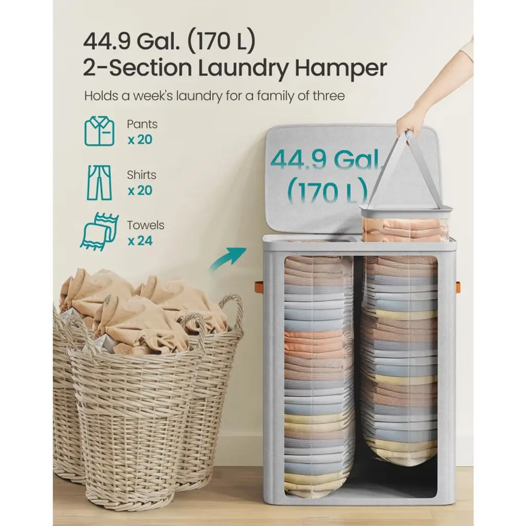 44.9 Gal Large Laundry Hamper With Lid, 2 Compartment Dirty Clothes Basket, Removable Inner Bags & Handles, 22x15.7x29.5 Inches, Dove Gray