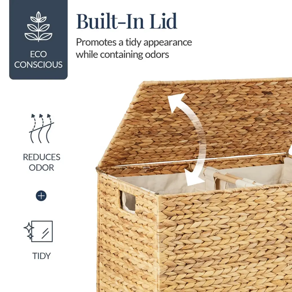 Simplify and enhance laundry day with this extra-large authentic double hamper basket! Organize easily with this large basket that holds up to 100 gallons of laundry and easily separate the whites from the colors in a breeze. Keep the room fresh from odors with a lid top that keeps the room tidy and prevents dirty clothes from peeking out. Your laundry hamper comes with removable, machine-washable liners to separate colors and operate as bags when needed and has two open handles on the side to make transporting a breeze. This ecofriendly organizer is sturdily designed with metal wiring to ensure durable support and handwoven with 100% water hyacinth for a water-resistant, earthy design that complements any room.