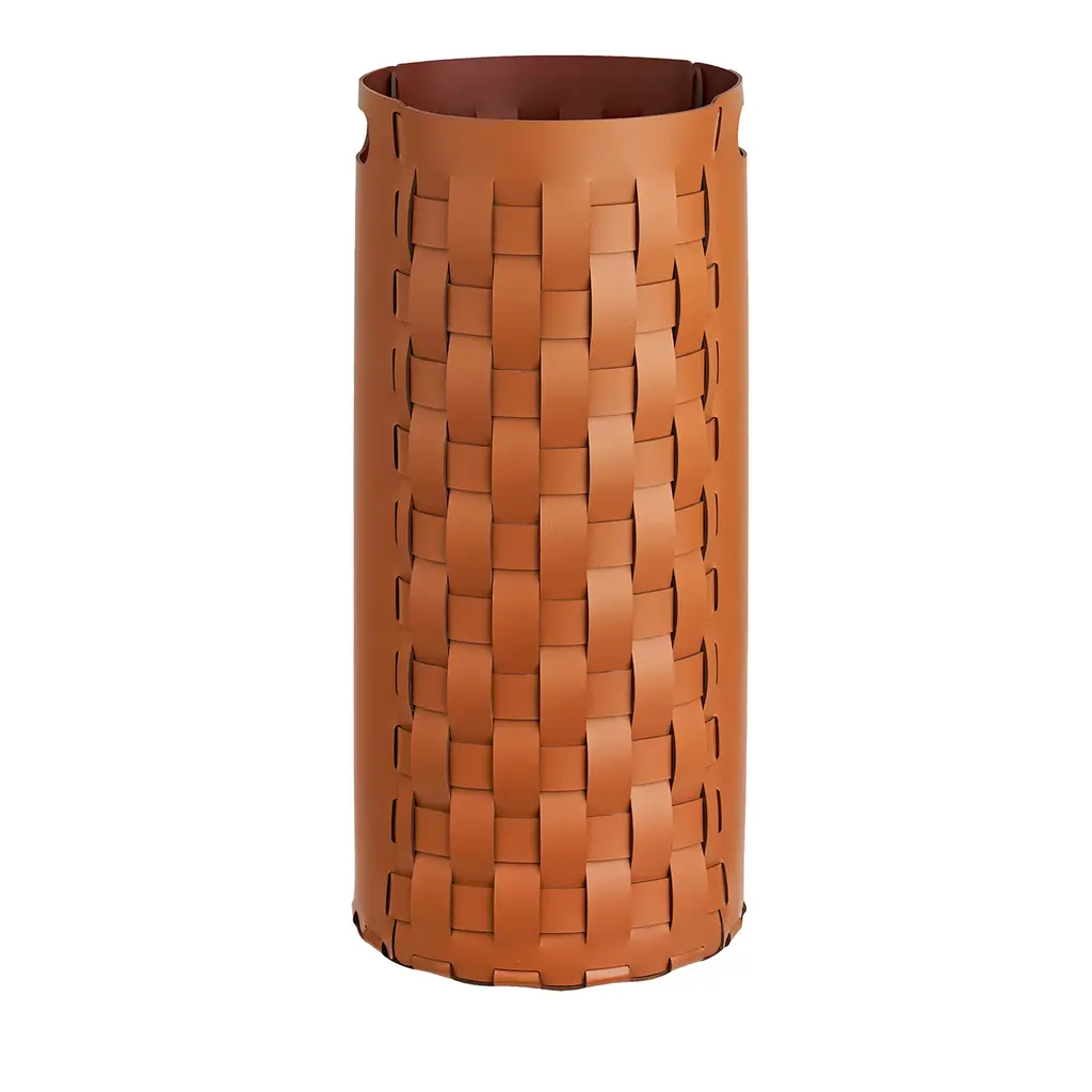 A celebration of functional elegance, this classic cognac basket seduces with its chunky wave, wicker-inspired pattern of rectangles and squares. The rich hue enhances its intricate texture, creating a mesmerizing interplay of light and shadow. Ekaterina Borovkova's versatile design, featuring an interior textile bag and optional lid, transcends the laundry room, gracing diverse settings with unique refinement.