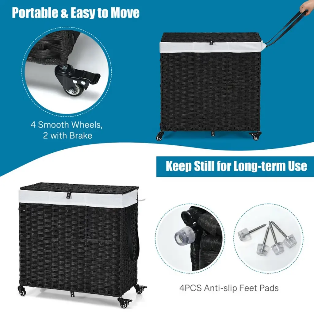 This laundry hamper aims at those who are tired of piles of clothes will immediately get rid of the days when clothes are nowhere to place. The sturdy iron frame can bear plenty of clothes. Premium PE rattan is waterproof and not easy to deform, which is suitable for damp places, such as laundry room and bathroom. Moreover, 4 universal wheels and PU strap make it convenient to carry and move the hamper. Our hamper is equipped with a lid to protect your privacy well. Thanks to its 125L large storage space, it fits clothes, toys, books and other items and keeps your home clean and tidy. Each family will need such a must-have hamper!FeaturesSturdy iron frame and premium PE rattan make the hamper sturdy and durable 125L large capacity provides plenty of space for clothes and toys of different sizes Equipped with 4 anti-slip foot pads to make hamper more stable 4 detachable and universal wheels and the PU strap make it easy to move and carry 2 detachable laundry cloth covers make sorting clothes easier and more convenient Convertible lid prevents items inside from dust and protects user's privacy Simple and classic design can be integrated with any decor style Easy to assemble with two installation plans providedColor: Black / Brown / Natural Material: Steel + PE + PU Overall Dimension (with Wheels): 25.5'' x 13'' x26'' (L x W x H) Capacity: 125L Net Weight: 11 lbs Weight Capacity: 110 lbs Package includes: 1 X Laundry Hamper 2 X Liner Bag