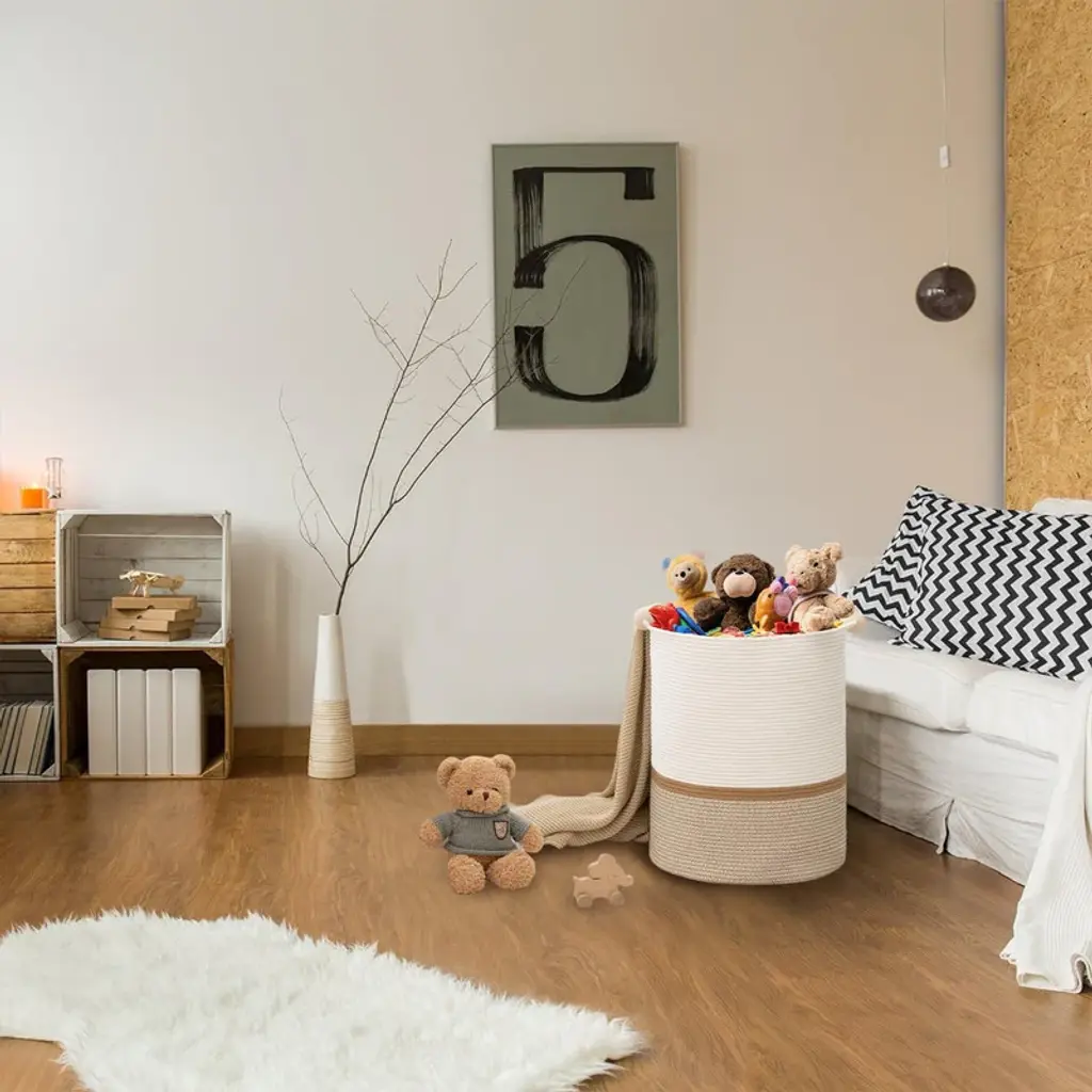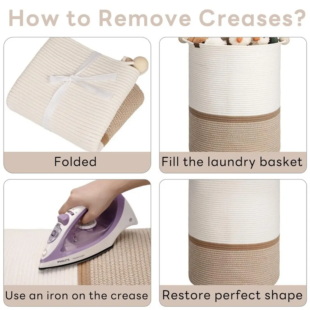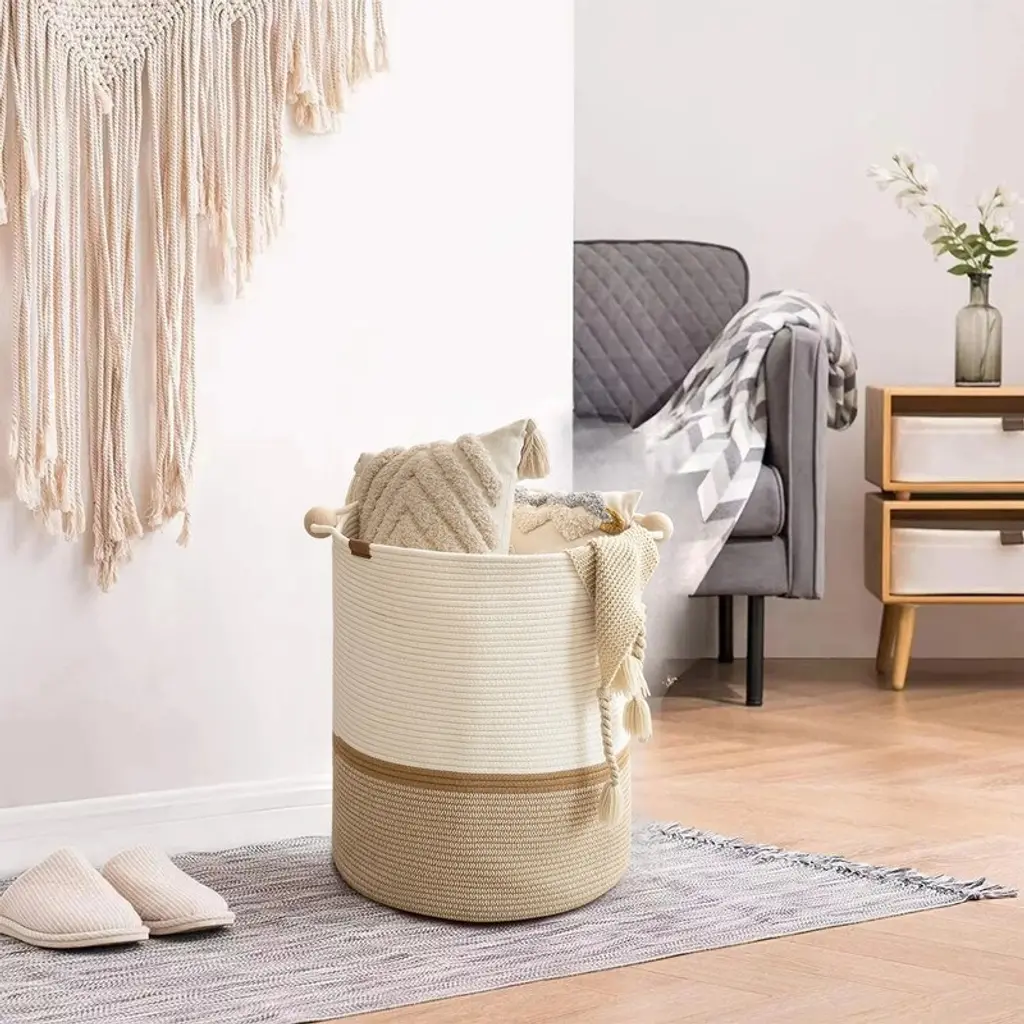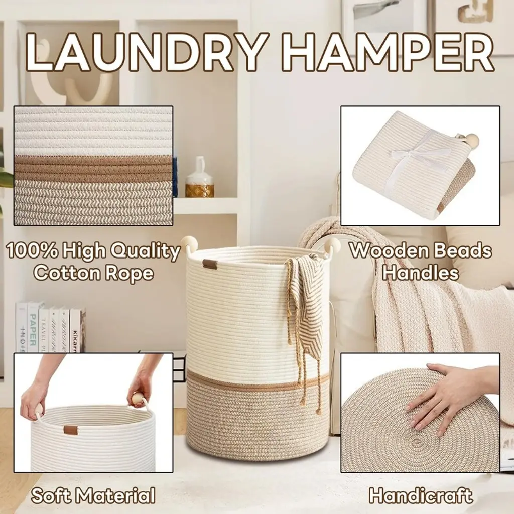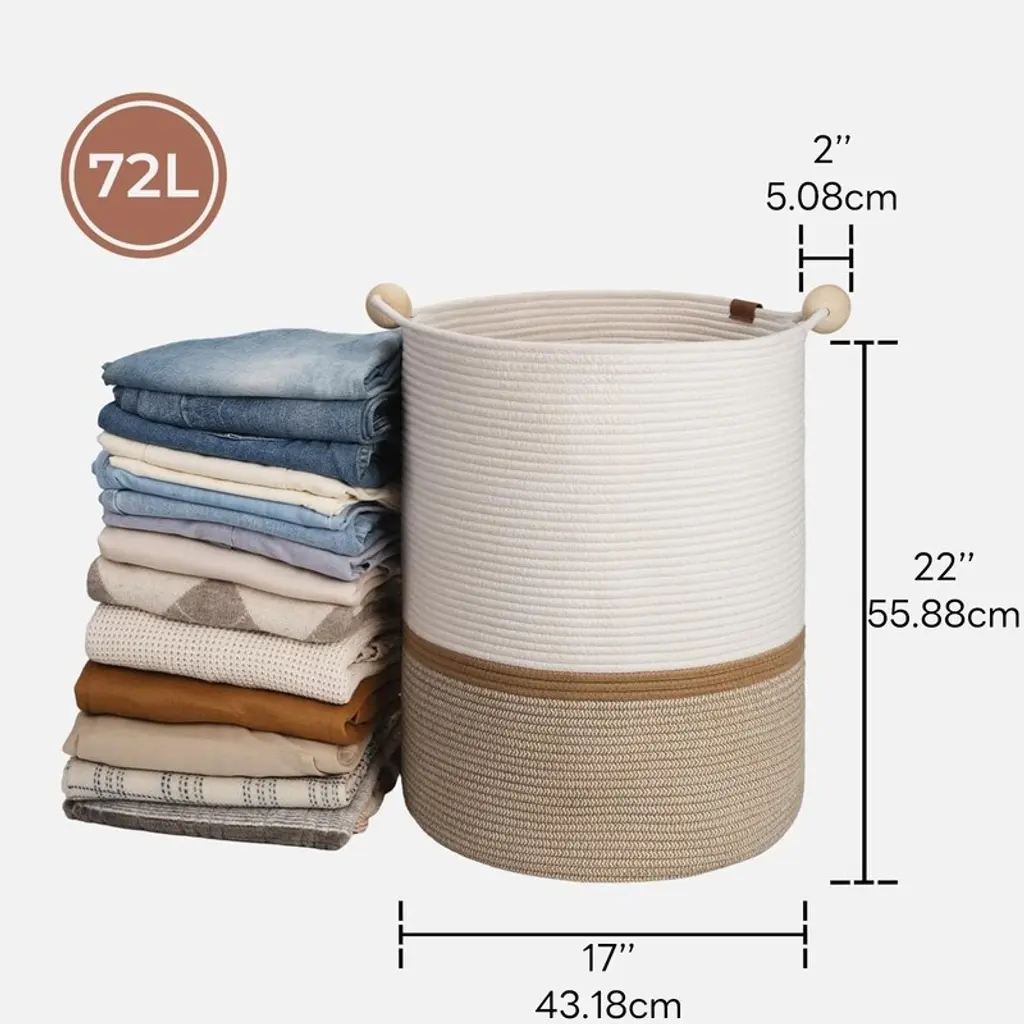 Cotton Rope Laundry Basket,with Wooden Beads Handles,portable,folded,storage For Clothes,blankets,dolls,etc - Khaki - 72 L