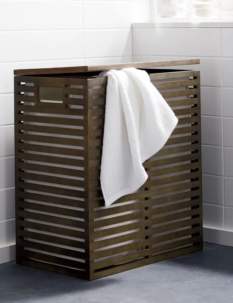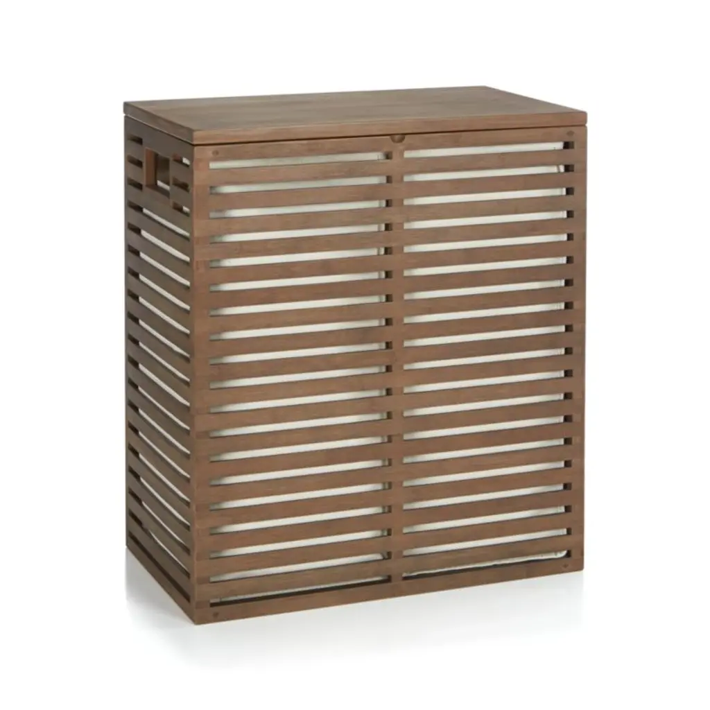 Bamboo goes at right angles as a clean-lined, natural hamper. This updated classic features a slatted, breathing design in beautifully washed bamboo with a removable, machine-washable canvas liner. Each beautifully crafted hamper glows with a warm brown finish that suits all decors.