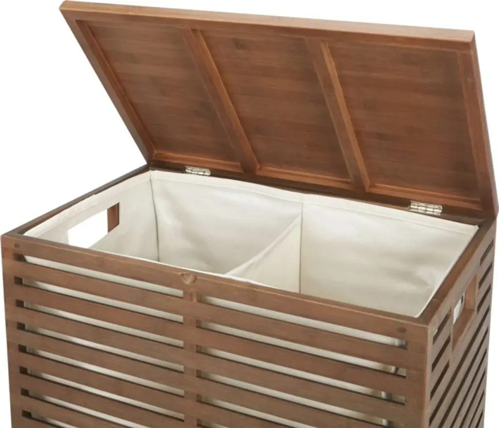 Bamboo goes at right angles as a clean-lined, natural hamper. This updated classic features a slatted, breathing design in beautifully washed bamboo with a removable, machine-washable canvas liner. Each beautifully crafted hamper glows with a warm brown finish that suits all decors.
