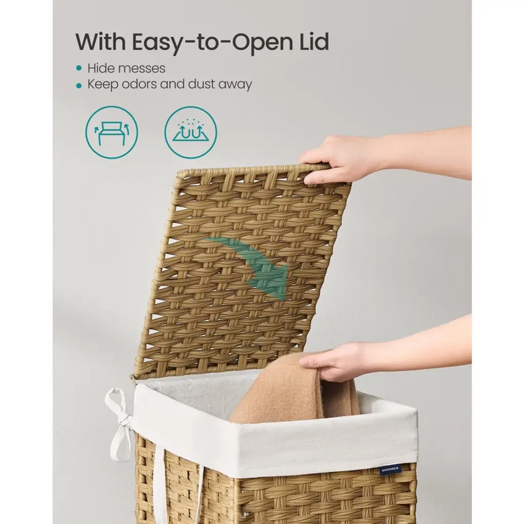 This compact 15.7"L x 11.8"W x 12.2"H laundry hamper features a synthetic rattan design with a lid to conceal laundry and control odors. The removable, machine-washable liner includes handles for easy transport, while the waterproof and breathable construction keeps contents dry. Foldable for storage and equipped with protective feet, it’s ideal for bathrooms, bedrooms, or tight spaces. Product Size: 15.7"L x 11.8"W x 12.2"H (40 x 30 x 31 cm) Product Weight: 4.1 lb (1.9 kg) Max. Static Load Capacity: 11 lb (5 kg)