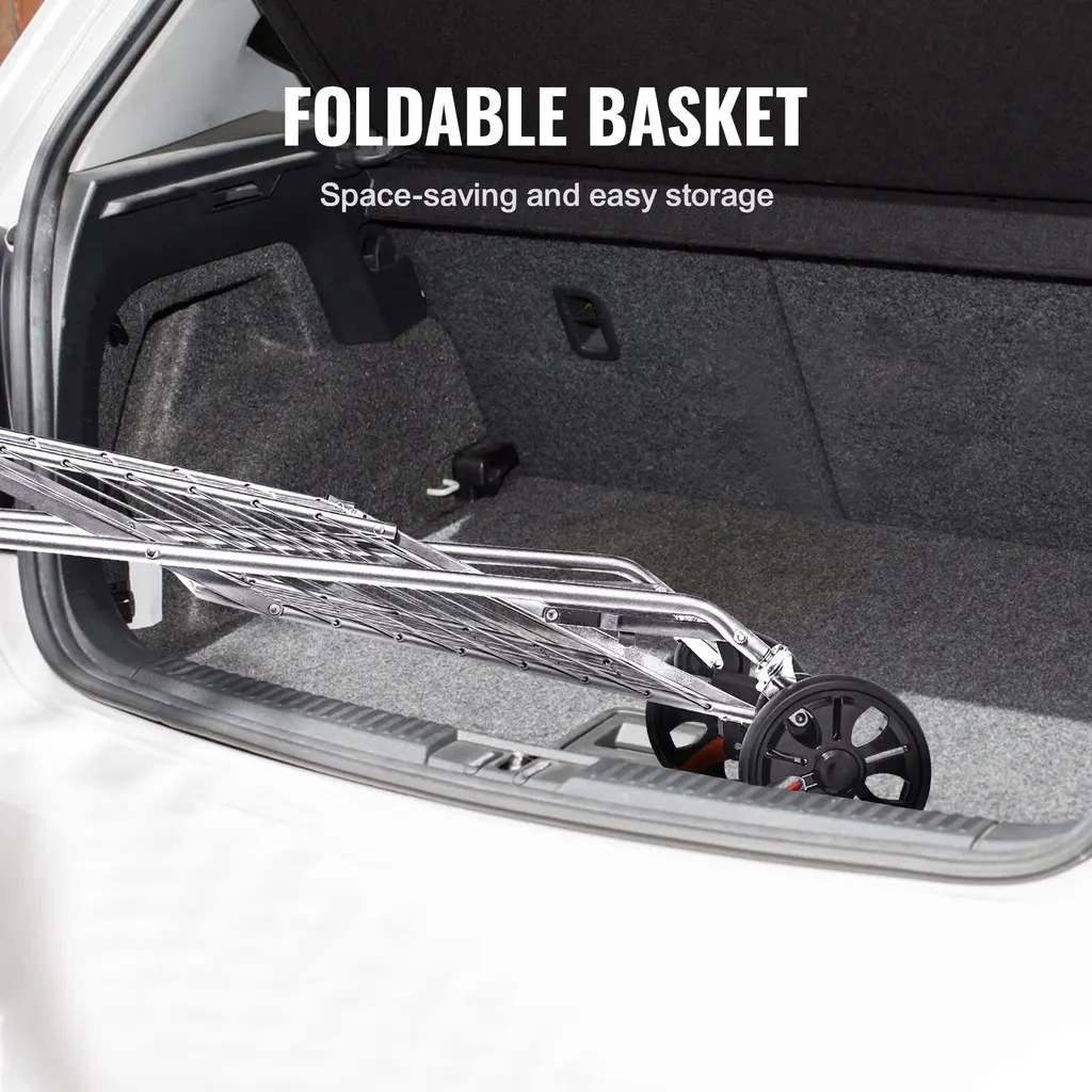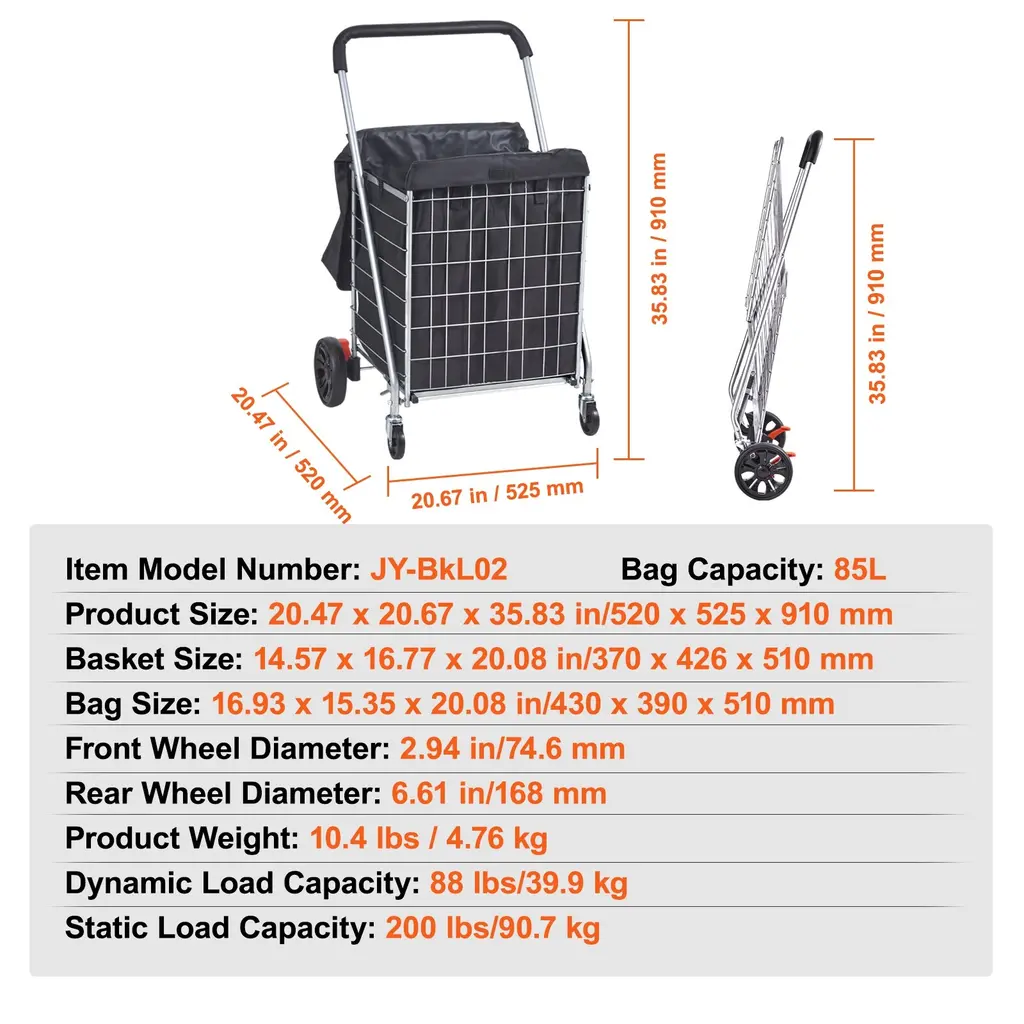 Travel Light but Load Heavy (for 110 lbs capacity option): Unfolded Size: 19.09 x 18.31 x 34.84 inches; Basket Size: 12.60 x 14.37 x 18.70 inches. Talk about 55L of shopping fun. The folding shopping cart holds up to 66 lbs on the move and 110 lbs when stationary. Even though it's crafted from sturdy iron and sponge tubing, the whole cart is as feather-light as 8.82 lbs. Travel Light but Load Heavy (for 66 lbs capacity option): Unfolded Size: 18.11 x 16.73 x 32.28 inches; Basket Size: 11.22 x 12.60 x 17.72 inches. Talk about 45L of shopping fun. The folding shopping cart holds up to 55 lbs on the move and 66 lbs when stationary. Even though it's crafted from sturdy iron tubing, the whole cart is as feather-light as 7.94 lbs. Travel Light but Load Heavy (for 200 lbs capacity option): Unfolded Size: 20.47 x 20.67 x 35.83 inches; Basket Size: 14.57 x 16.77 x 20.08 inches; Bag Size: 16.93 x 15.35 x 20.08 inches. Talk about 85L of shopping fun. The folding shopping cart holds up to 88 lbs on the move and 200 lbs when stationary. Even though it's crafted from sturdy iron tubing, the whole cart is as feather-light as 11.57 lbs. Style Meets Substance: Say goodbye to wobbly shopping carts and hello to our smooth operator. Its body boasts a snazzy, durable surface finish, while the handle is padded for your pampered hands. A dense net bottom paired with resilient poles ensures your groceries stay right where they should. For 200 lbs capacity option: The included bag is crafted from 600D+PVC material to stay reliable, rain or shine. Turn & Glide with Euphoria: Here's some wheel talk — our front ones are 2.94 inches and swivel a cool 360 degrees. The back ones are bold 6.61 inches (for 110 lbs / 200 lbs capacity option) / 5.75 inches (for 66 lbs capacity option), staying true to their path. Whether you're navigating city sidewalks or supermarket aisles, our foldable utility cart's got your back. And stair-climbing is a piece of cake. Small Space, Big Dreams: Our grocery cart folds up snugly, ready to sneak into tight spots. Designed with love for our senior shoppers, back pain warriors, and expecting mothers. From groceries to toys, this cart's ready for any mission. And it's always up for a trip, fitting easily in cars or buses. Snap, Fold, Go: Our cart's sturdy frame is a breeze to set up, and that foam handle is pure comfort. Whether you're on a shopping spree, a camping adventure, or tending to your garden, this foldable cart is your loyal sidekick. And when done, fold it up and tuck it away — out of sight but always ready for action. Package Content 1 x Shopping Cart