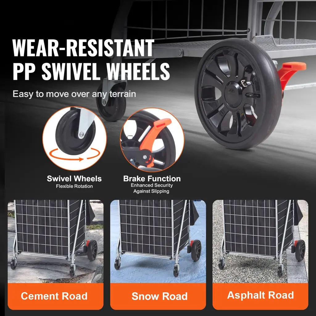 Folding Shopping Cart, Grocery Utility Cart With Rolling Swivel Wheels, Heavy Duty Foldable Laundry Basket Trolley - 200 Lbs Capacity