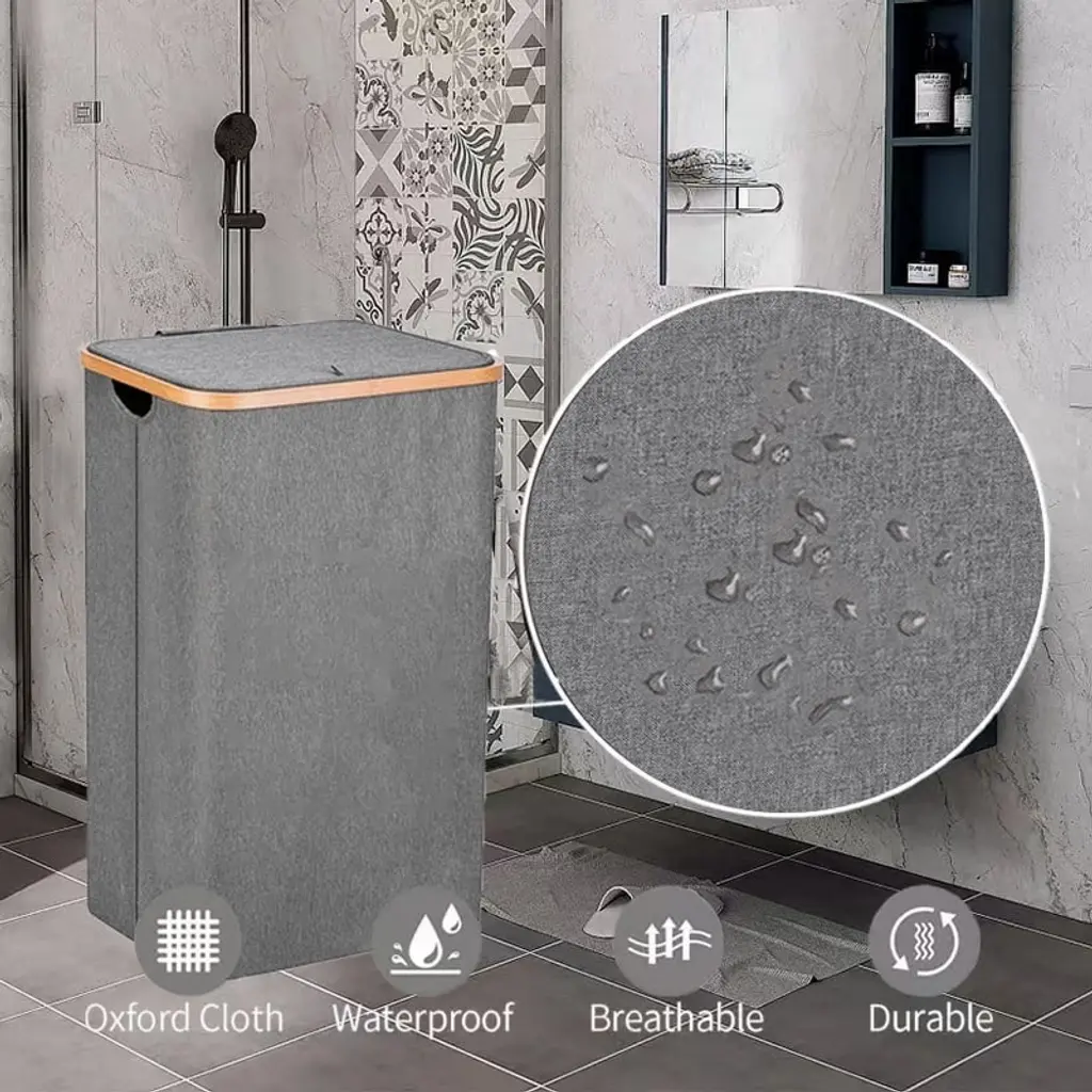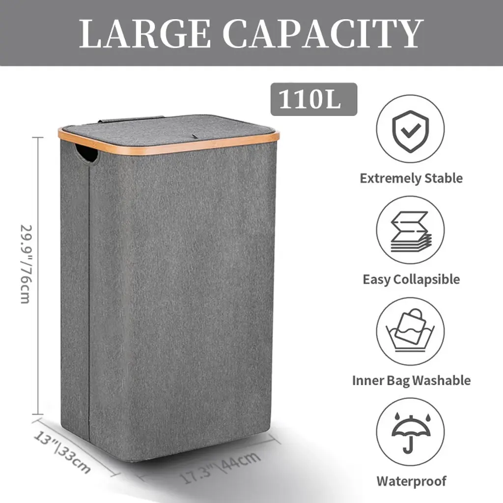 Gsluuk 105l Waterproof Collapsible Laundry Hamper With Lid & Bamboo Handles, Removable Bag, Grey