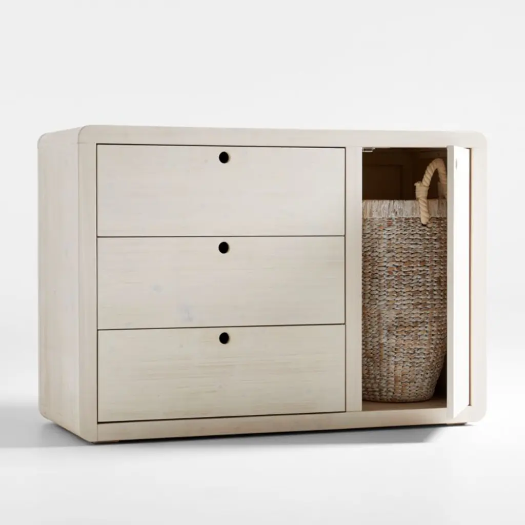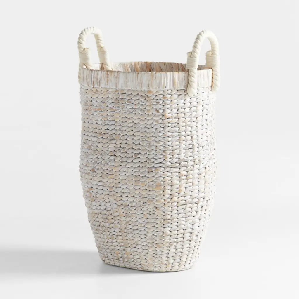 How neat! Chunky braids of whitewashed water hyacinth weave intricately around an iron frame in this tall floor bin, ready to corral extra blankets or laundry in all of its homespun-inspired charm. Sturdy cotton handles are soft to the touch but strong enough for toting between rooms. The vertical profile lets it easily tuck into closets, corners or within the side cabinet of our Montauk extra-wide dresser. Designed in collaboration with Leanne Ford, this bin collection is a Crate & Kids exclusive.Our exclusive collab with star designer and mom Leanne Ford is back by popular demand. This new collection is all about design-forward shapes and warm neutrals that let young imaginations roam free.