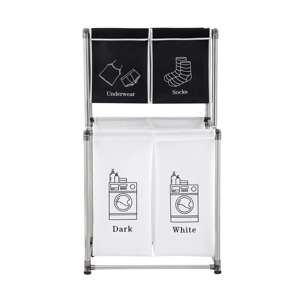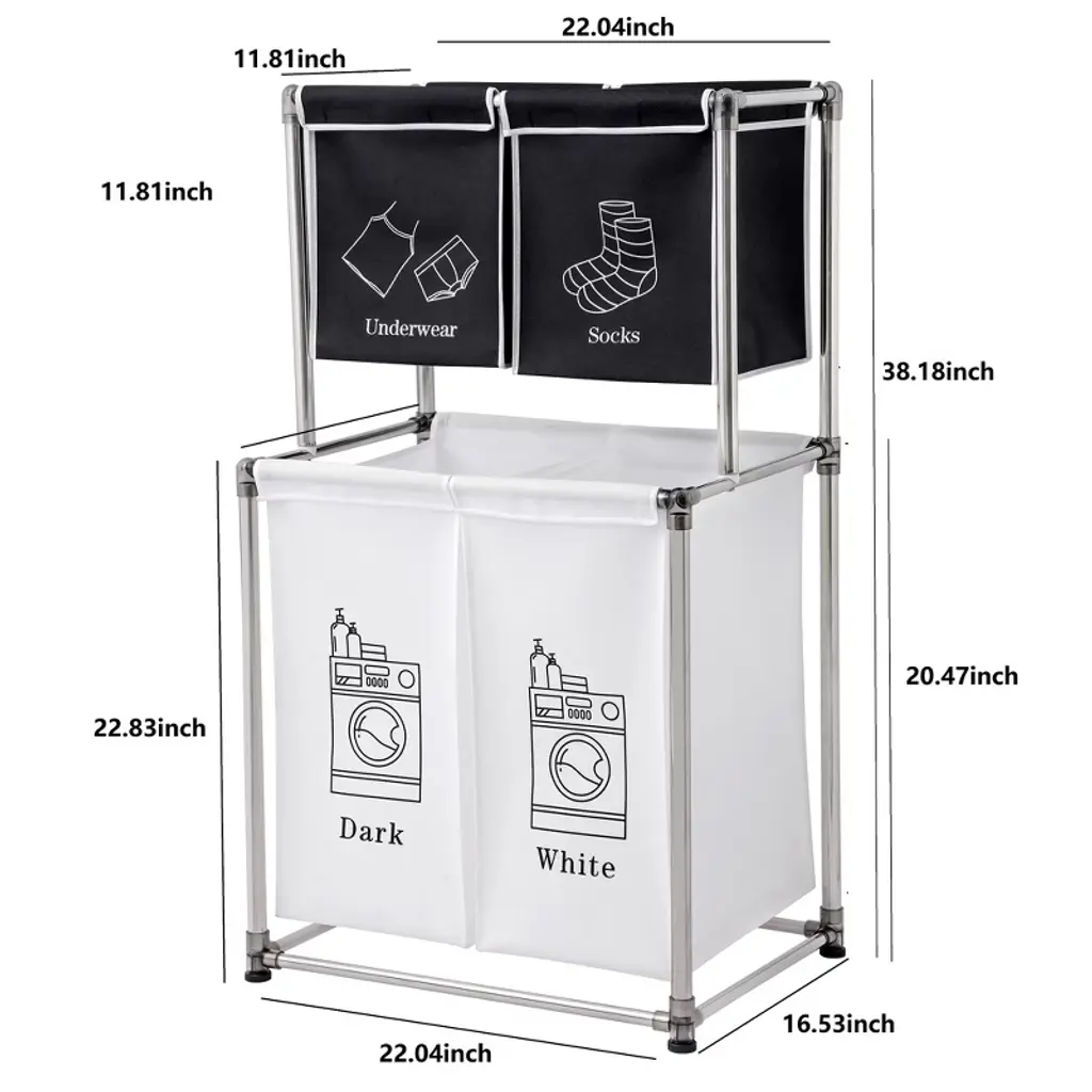 Revolutionize laundry day with our 4-bag laundry sorter hamper, designed for effortless clothes organization. Featuring labeled removable bags for darks, lights, delicates, and small items, this heavy-duty sorter keeps clothes separated and stain-free. Built with a reinforced aluminum frame, waterproof 60D Oxford fabric, and non-slip base, it offers durable, high-capacity storage (38"H x 22"L x 16"W) for families. Easy assembly and secure Velcro closures make it a must-have for any home.