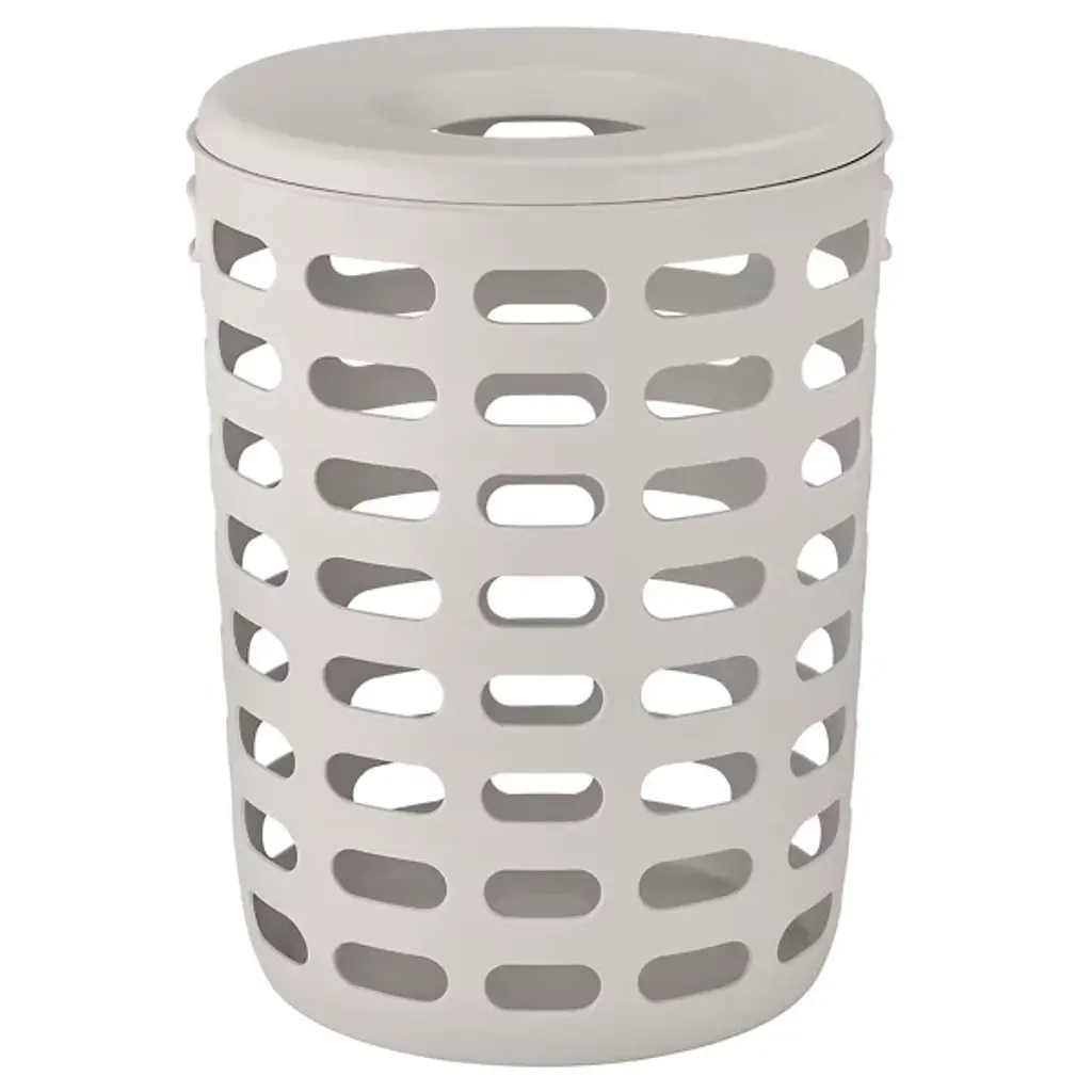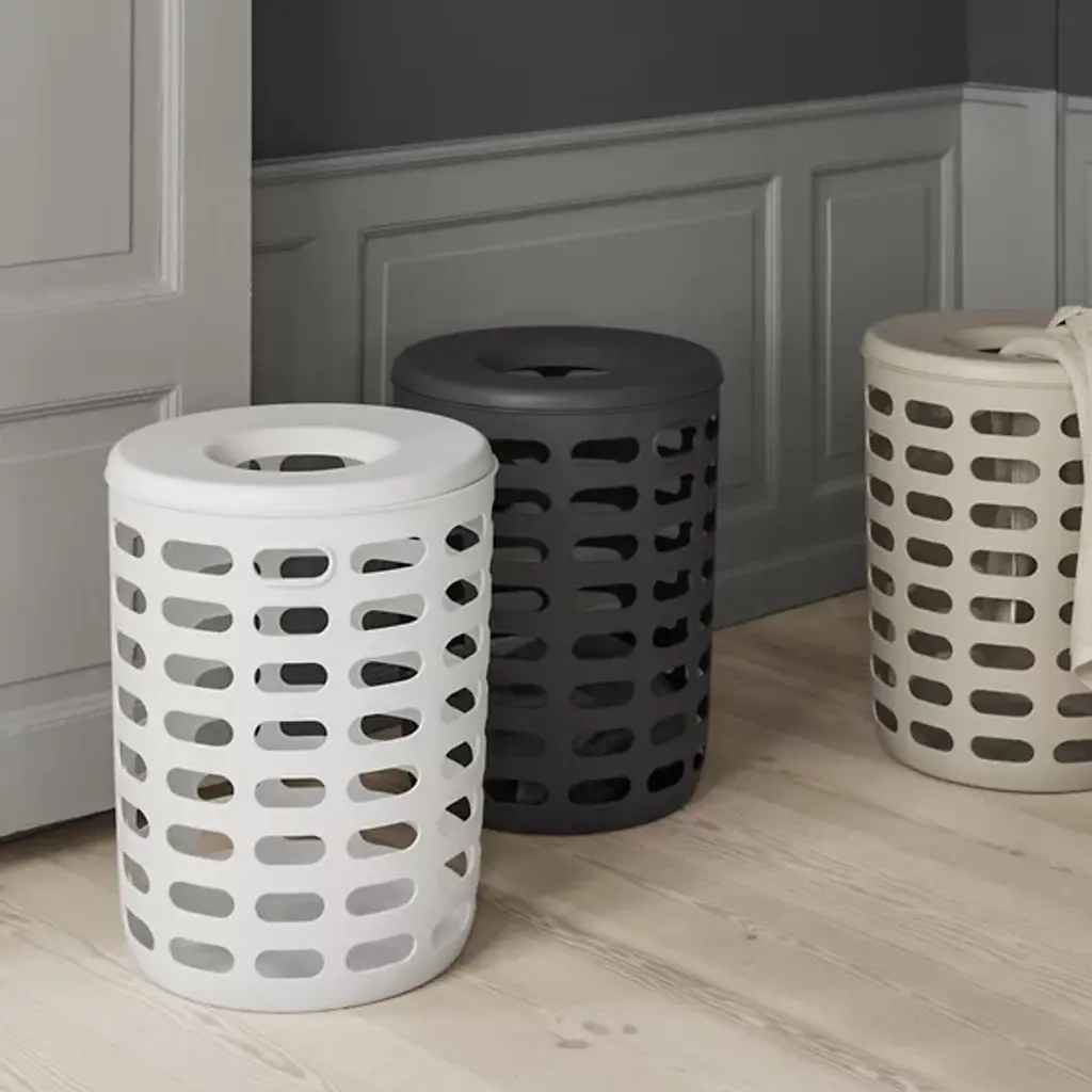 The Korie Laundry Basket from Blomus is a clean-surfaced, contemporary cylinder made of strong plastic, featuring oval cutouts around the sides to facilitate movement. The central hole in the removable top offers retention and concealment of its contents, making it easy to make a game out of tossing in socks and other items.