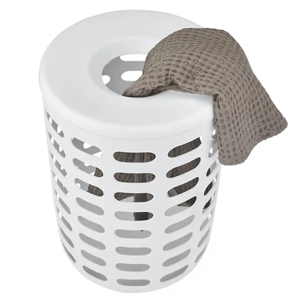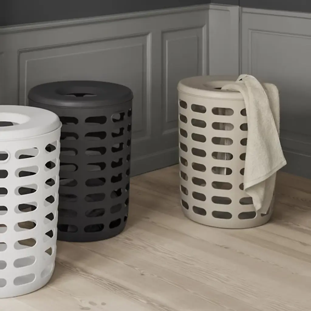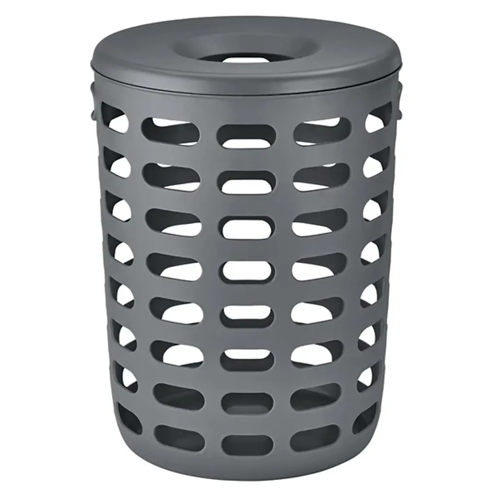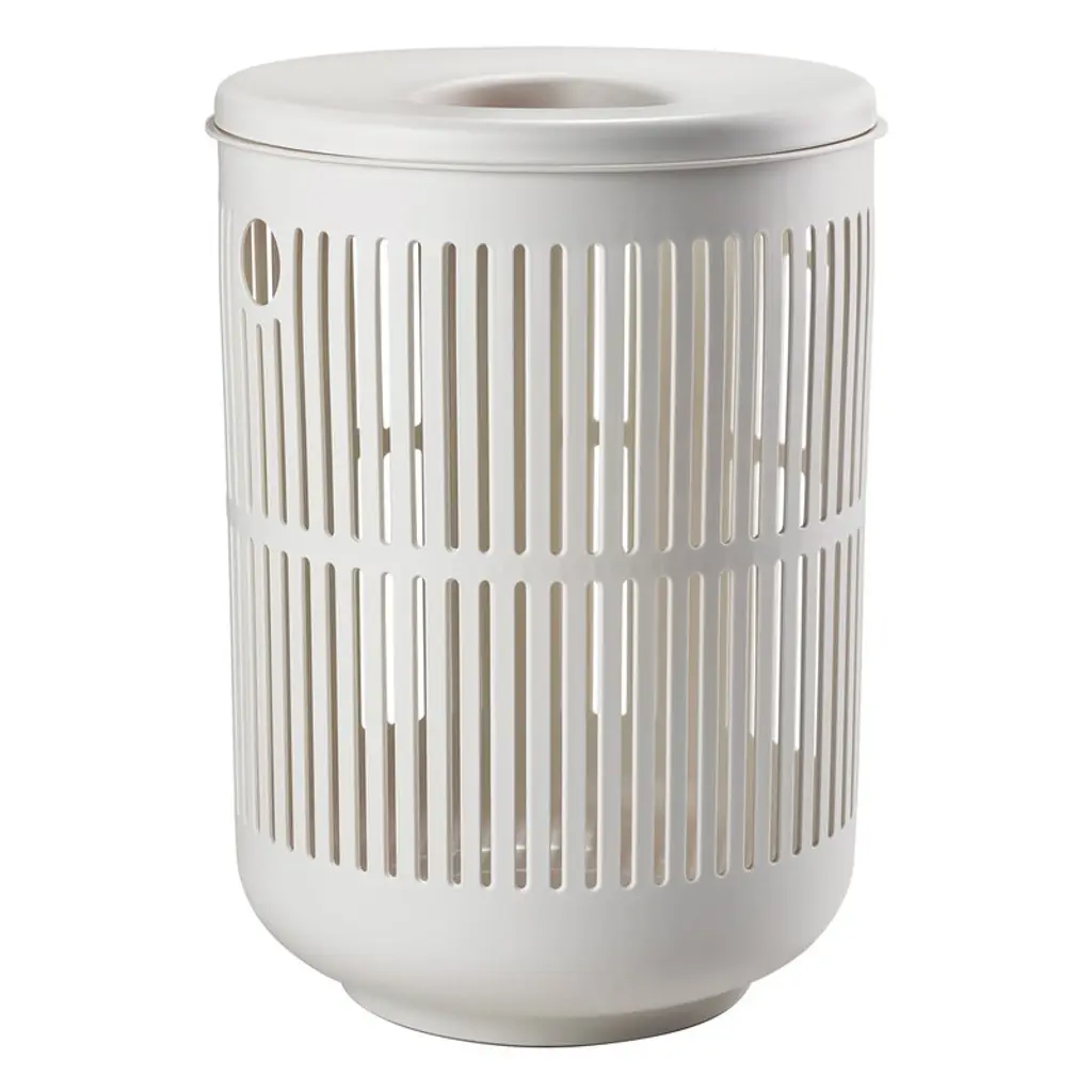 The Korie Laundry Basket from Blomus is a clean-surfaced, contemporary cylinder made of strong plastic, featuring oval cutouts around the sides to facilitate movement. The central hole in the removable top offers retention and concealment of its contents, making it easy to make a game out of tossing in socks and other items.