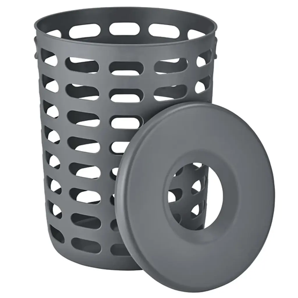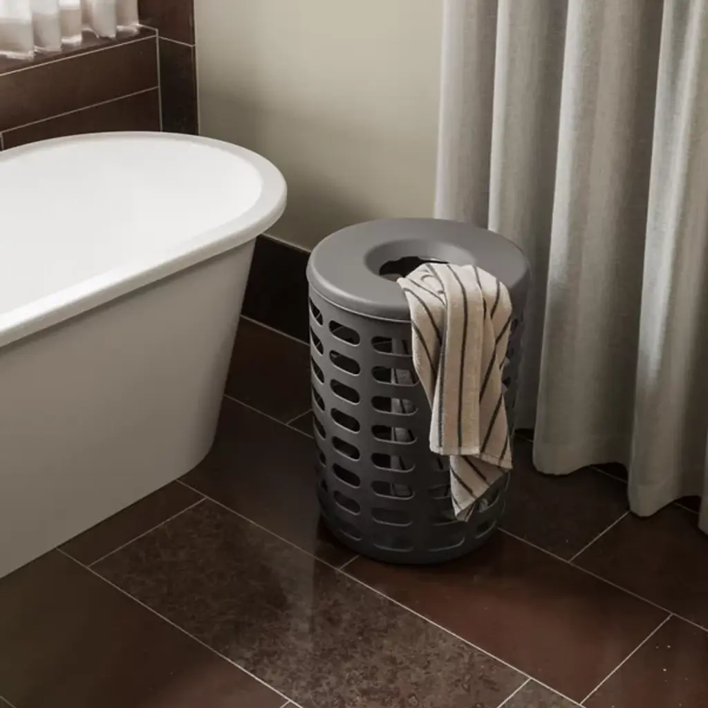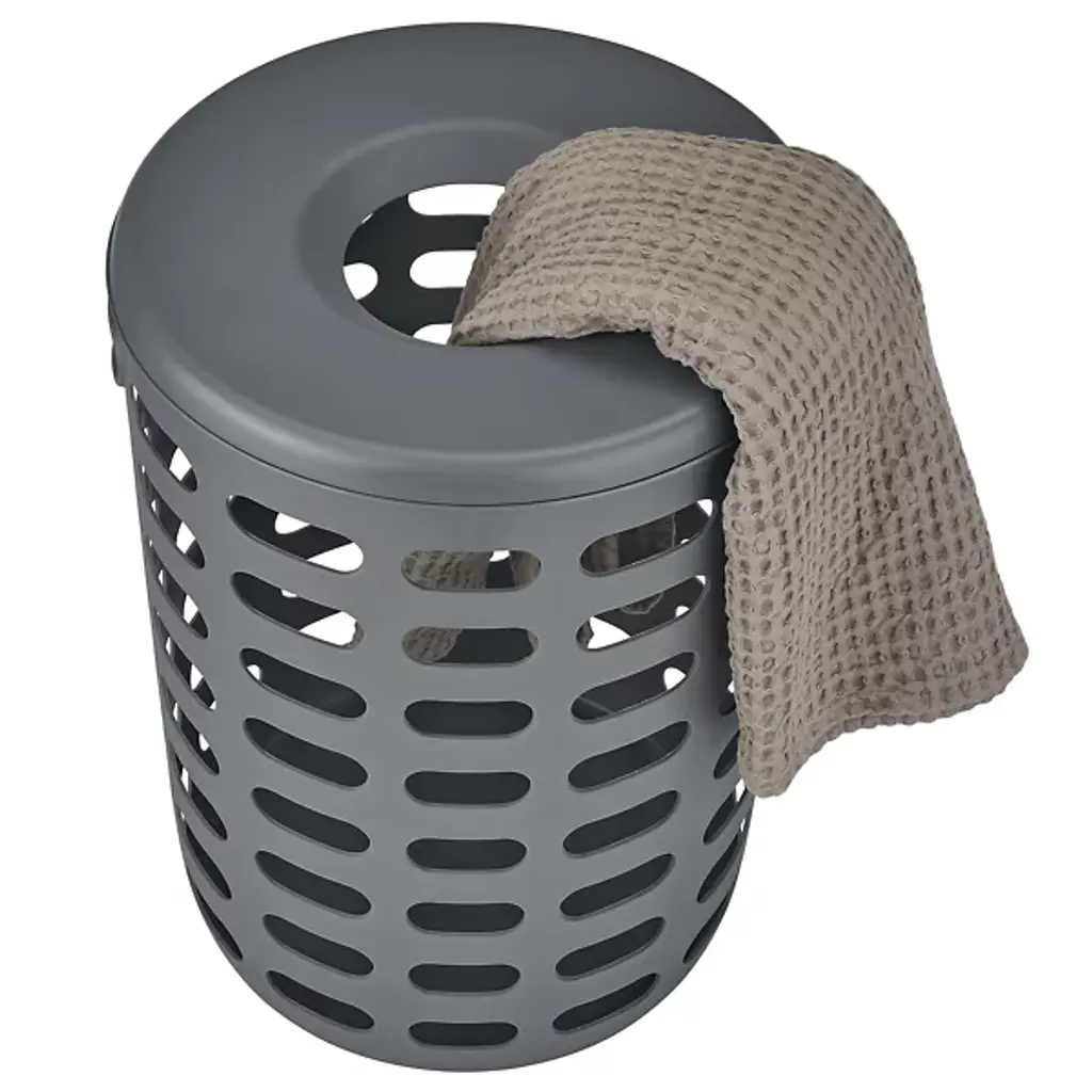 The Korie Laundry Basket from Blomus is a clean-surfaced, contemporary cylinder made of strong plastic, featuring oval cutouts around the sides to facilitate movement. The central hole in the removable top offers retention and concealment of its contents, making it easy to make a game out of tossing in socks and other items.