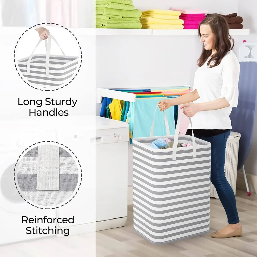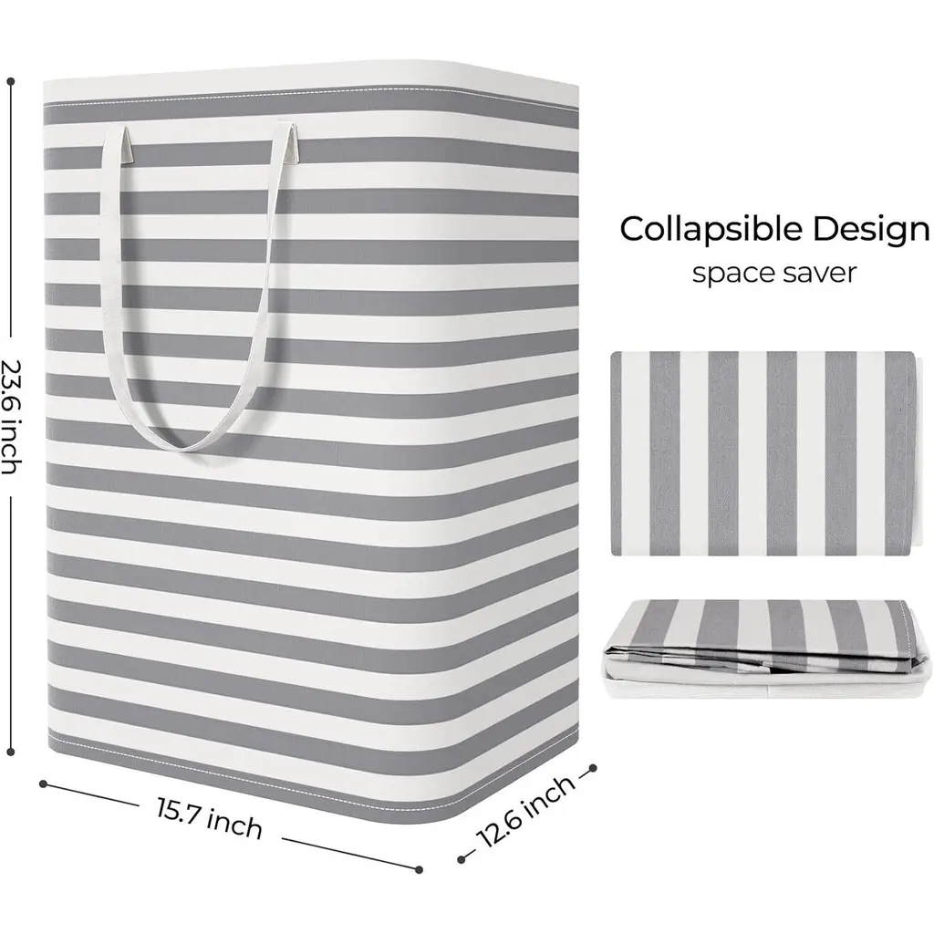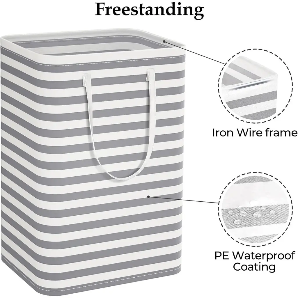 【Collapsible Laundry Hamper】Folds flat when not in use to save space. High-quality storage basket to keep room clean and tidy. Suitable for bedroom, laundry room, nursery, dormitory, home, bathroom, balcony, and shopping. 【Large Capacity】Laundry hamper size 15.7in*12.6in*23.6in /40cm*32cm*60cm (L*W*H) with a large capacity of 75L. This hamper is suitable for storing clothes, towels, socks, sweaters, etc., and is large enough to hold dirty clothing for the whole family. 【Freestanding】No complicated setup. Simply stretch out the clothes basket, and the rigid iron wire at the top edge of this laundry bin will stay upright, whether empty or full. 【Reinforced Handles】Two handles and reinforced stitching ensure that the handles will not rip, even when the hamper is filled with clothes. The long handle design supports easy carrying even with one hand, leaving the other hand free to open doors or open the washing machine. 【Waterproof Material】This clothes basket is made of thick cotton and linen fabric. The polyethylene coating provides a strong moisture barrier so that wet clothes do not soak through the hamper to prevent leakage. When the clothes basket is dirty, just wipe it with a wet towel or wash it with water, then air dry. Do not machine wash as the coating may break.