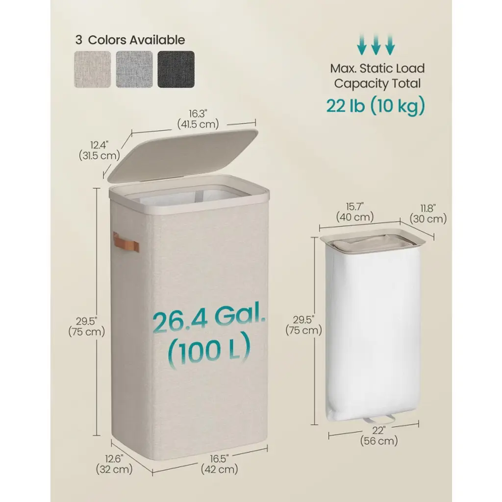 This laundry basket is designed to transform your laundry routine with its spacious compartment, ensuring all your laundry stay organized and out of sight. Effortlessly easy to assemble, this laundry hamper features a sturdy structure and a ready-to-use inner bag with convenient handles for quick removal and replacement. Transporting laundry is a breeze, even on stairs, thanks to multiple handles. The protective lid keeps your laundry private and dust-free, while the durable, easy-to-clean fabric maintains a neat appearance. Parameters: - Product Dimensions: 16.5"L x 12.6"W x 29.5"H (42 x 32 x 75 cm) - Net Weight: 3.5 lb (1.6 kg) - Max. Static Weight Capacity: 22 lb (10 kg)
