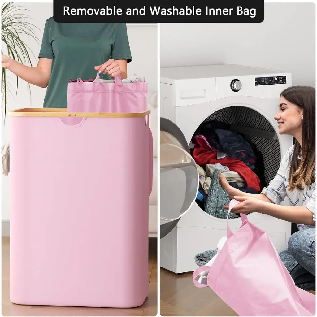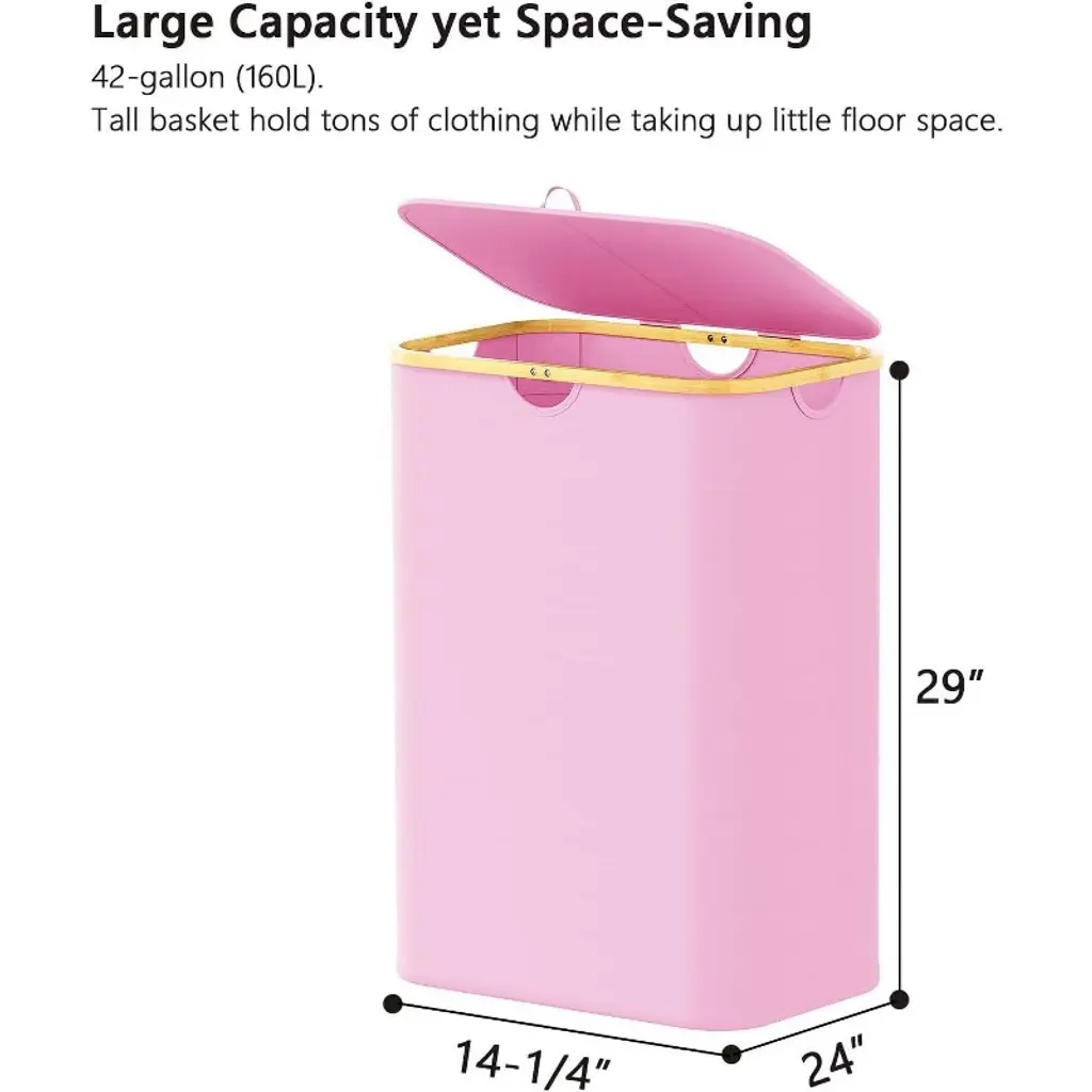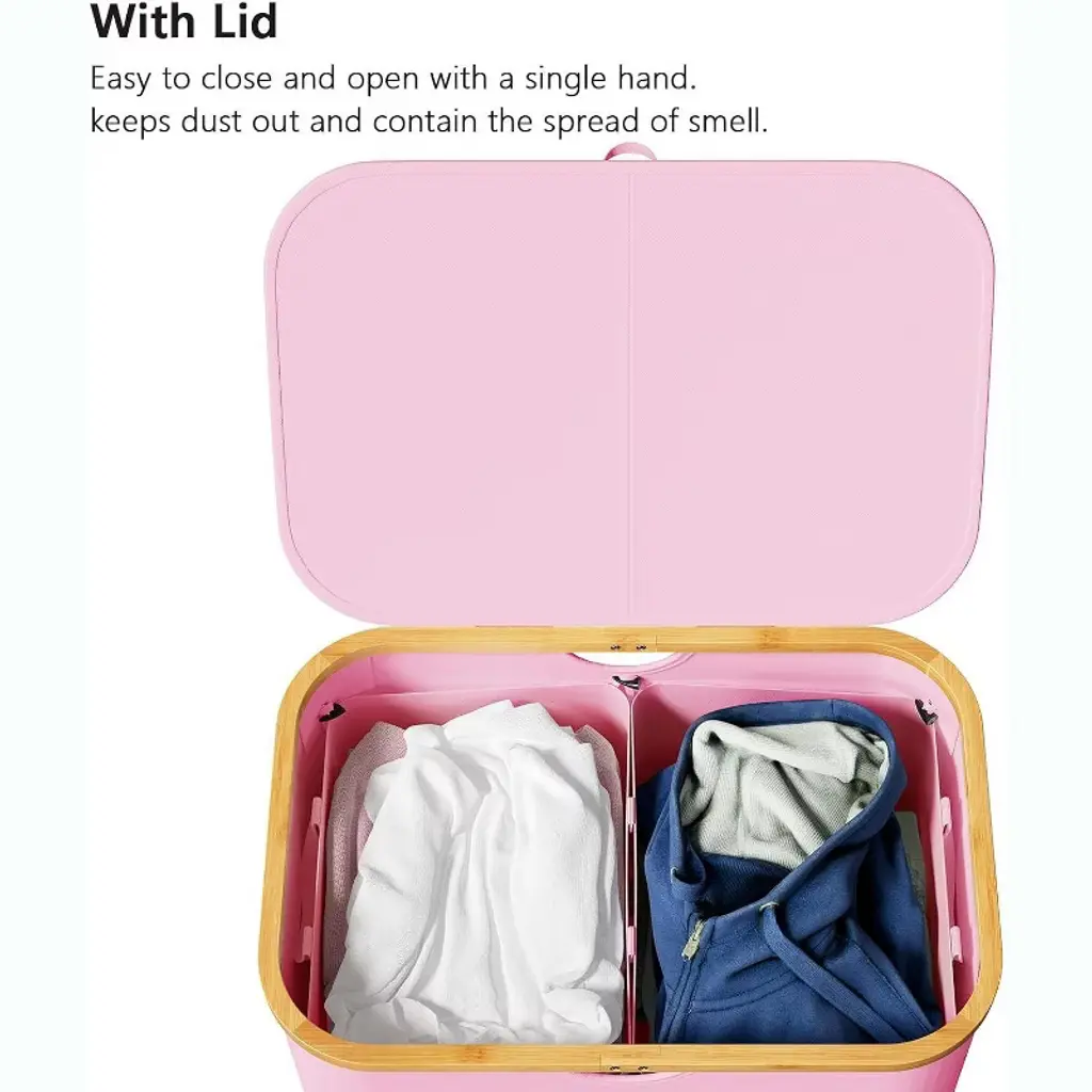 Keep your space tidy and organized with this large 160L laundry hamper. Designed as a 2-section laundry hamper, it makes sorting clothes simple and efficient. The laundry hamper comes with 2 removable bags, making it easy to carry loads to the washer. With a sturdy lid, this laundry hamper keeps dirty clothes out of sight, adding a clean look to any bedroom, bathroom, dorm, or laundry room. Bamboo handles bring style and comfort, while the collapsible design lets you store the laundry hamper when not in use. Choose this spacious, stylish, and practical laundry hamper to upgrade your daily routine.