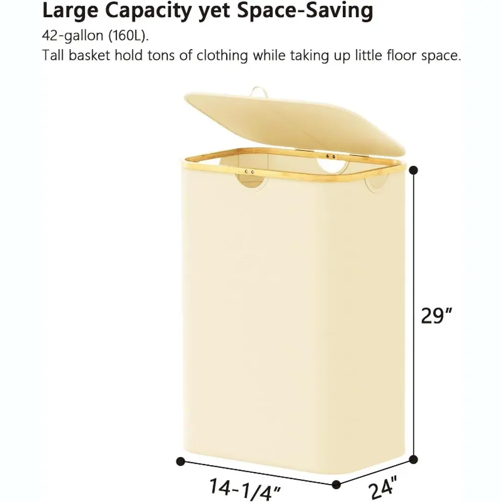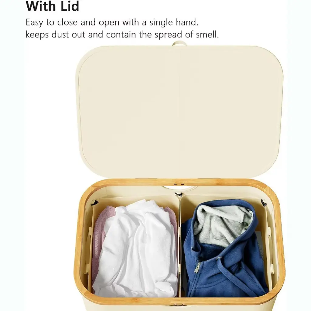 Keep your space tidy and organized with this large 160L laundry hamper. Designed as a 2-section laundry hamper, it makes sorting clothes simple and efficient. The laundry hamper comes with 2 removable bags, making it easy to carry loads to the washer. With a sturdy lid, this laundry hamper keeps dirty clothes out of sight, adding a clean look to any bedroom, bathroom, dorm, or laundry room. Bamboo handles bring style and comfort, while the collapsible design lets you store the laundry hamper when not in use. Choose this spacious, stylish, and practical laundry hamper to upgrade your daily routine.