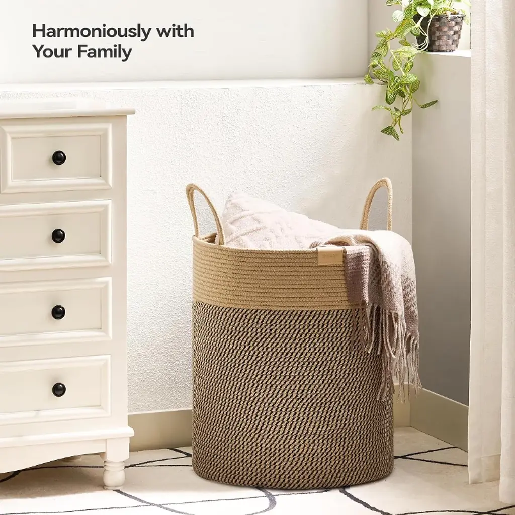 Large Capacity & Convenient Design: 62L laundry hamper is the perfect storage solution for your dirty clothes, toys, or any other items. The spacious design allows for easy organization and keeps your space clutter-free. Premium Quality & Natural Material: Made from 100% cotton, The natural material ensures that your clothes are kept fresh and free from any harmful chemicals. Say goodbye to cheap and flimsy hampers. Expert Craftsmanship: Each inch of our woven laundry basket is carefully stitched with 8 stitches, totaling 2250 stitches. No more worries about tearing or fraying . Versatile & Stylish: Featuring a trendy color-block design, this nursery laundry hamper complements any home decor style and can be used in various settings. With its convenient handles, you can easily move the blanket bin around wherever it's needed.