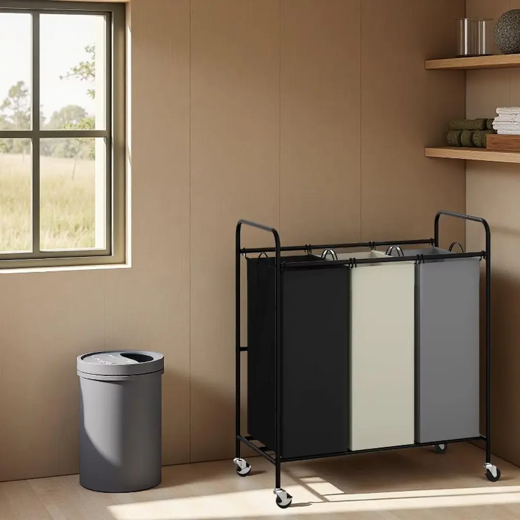 1.Heavy-Duty Construction for Long-Lasting UseThis laundry cart is built with a reinforced steel frame featuring thick steel pipes, paired with rip-resistant non-woven fabric, ensuring it withstands daily use without bending or tearing. Designed to handle the demands of large families, dorm rooms, or shared laundry spaces, each bag supports 11-17.6 lbs without sagging, making it a reliable solution for heavy loads of dirty clothes. 2.XL 40-Liter Bags for Efficient SortingEquipped with three spacious 40-liter bags, this hamper simplifies laundry organization¡ªdesignate one for whites, one for colors, and one for delicates to streamline washing day. Beyond laundry, these versatile bags are perfect for storing toys, stuffed animals, or pet supplies, making them a handy addition to nurseries, playrooms, or closets for all-around organization. 3.Smooth-Rolling Lockable Wheels for Easy MobilityFour 360¡ã silent wheels allow effortless movement, letting you roll the hamper from bedrooms to laundry rooms without tipping or making noise. Two of the wheels lock securely, keeping the cart in place when loading, unloading, or storing¡ªno more chasing a sliding hamper or struggling to drag heavy loads across the floor. 4.Tool-Free Assembly for Instant UseSetting up the laundry cart is quick and hassle-free: simply snap the frame together and attach the bags¡ªno tools or complicated steps required. It disassembles just as easily, making it convenient for storage during travel or when not in use. Clear, straightforward instructions ensure fast organization, so you can start using it right away. 5.Compact Design for Space-Saving ConvenienceWith its space-saving profile, this laundry hamper fits neatly in closets, bathrooms, or laundry room corners, maximizing storage without taking up excess space. The easy-to-disassemble design is especially ideal for tiny homes, RVs, and dorm rooms, where every inch counts¡ªkeeping your space tidy without cluttering it.