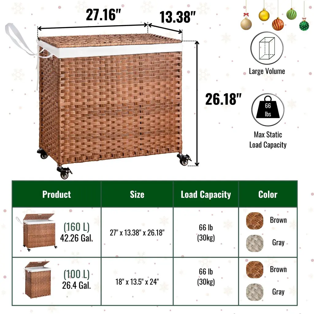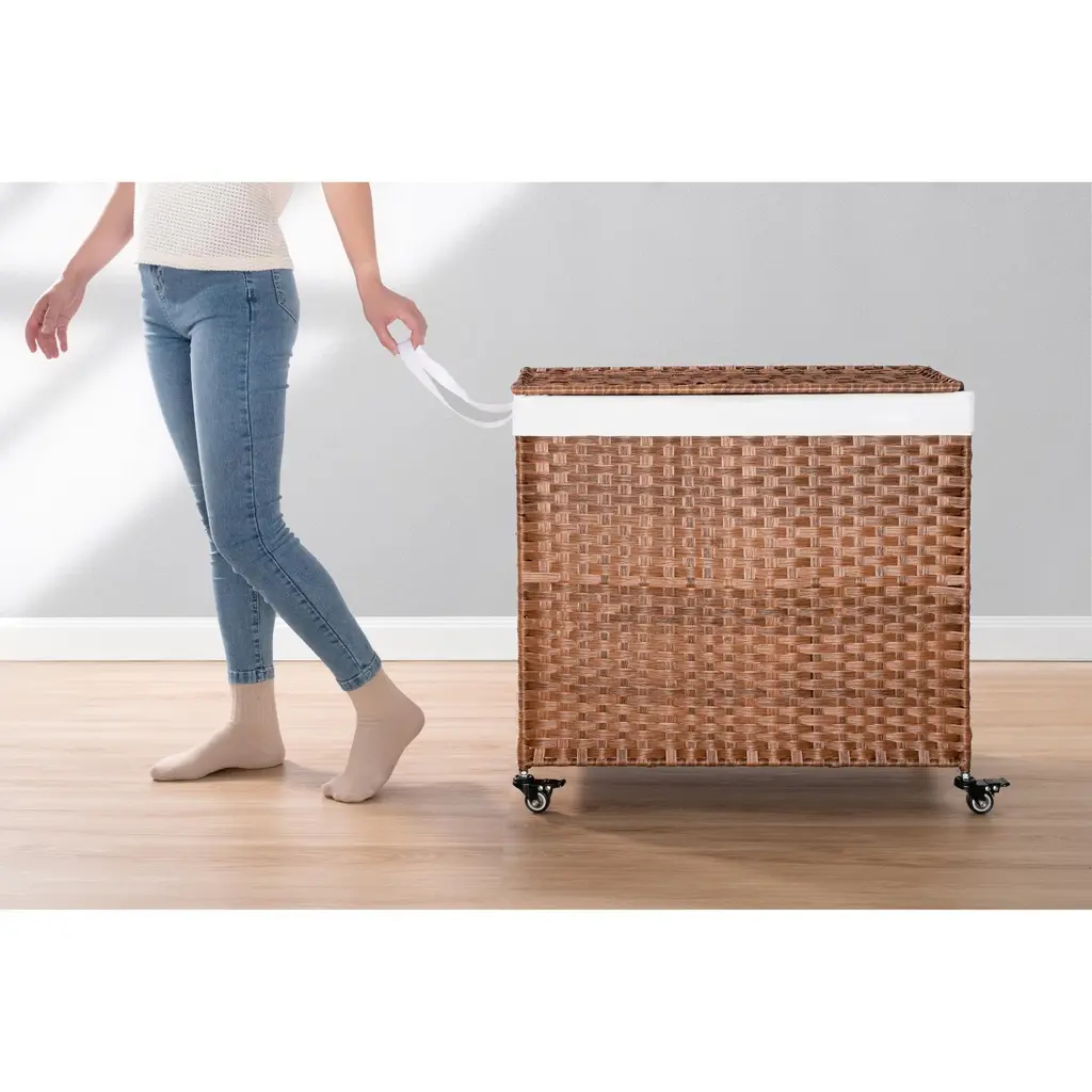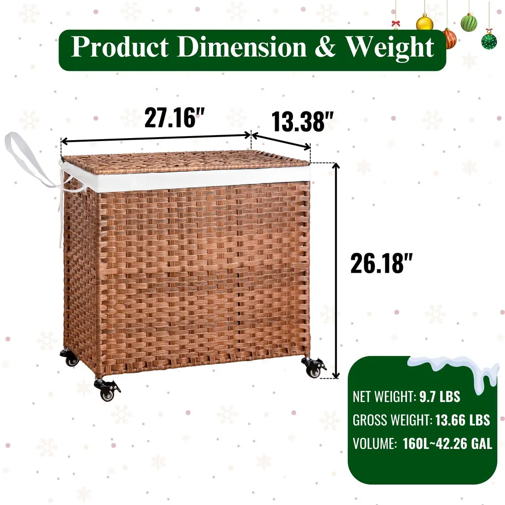 Laundry Hamper With Lid PE Rattan Powder Coating Frame Clothes Hampers with 02 Removable Bags, Wheels, 160L, Brown Color.Features:Specification: