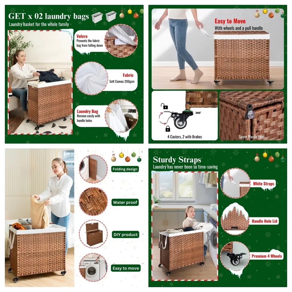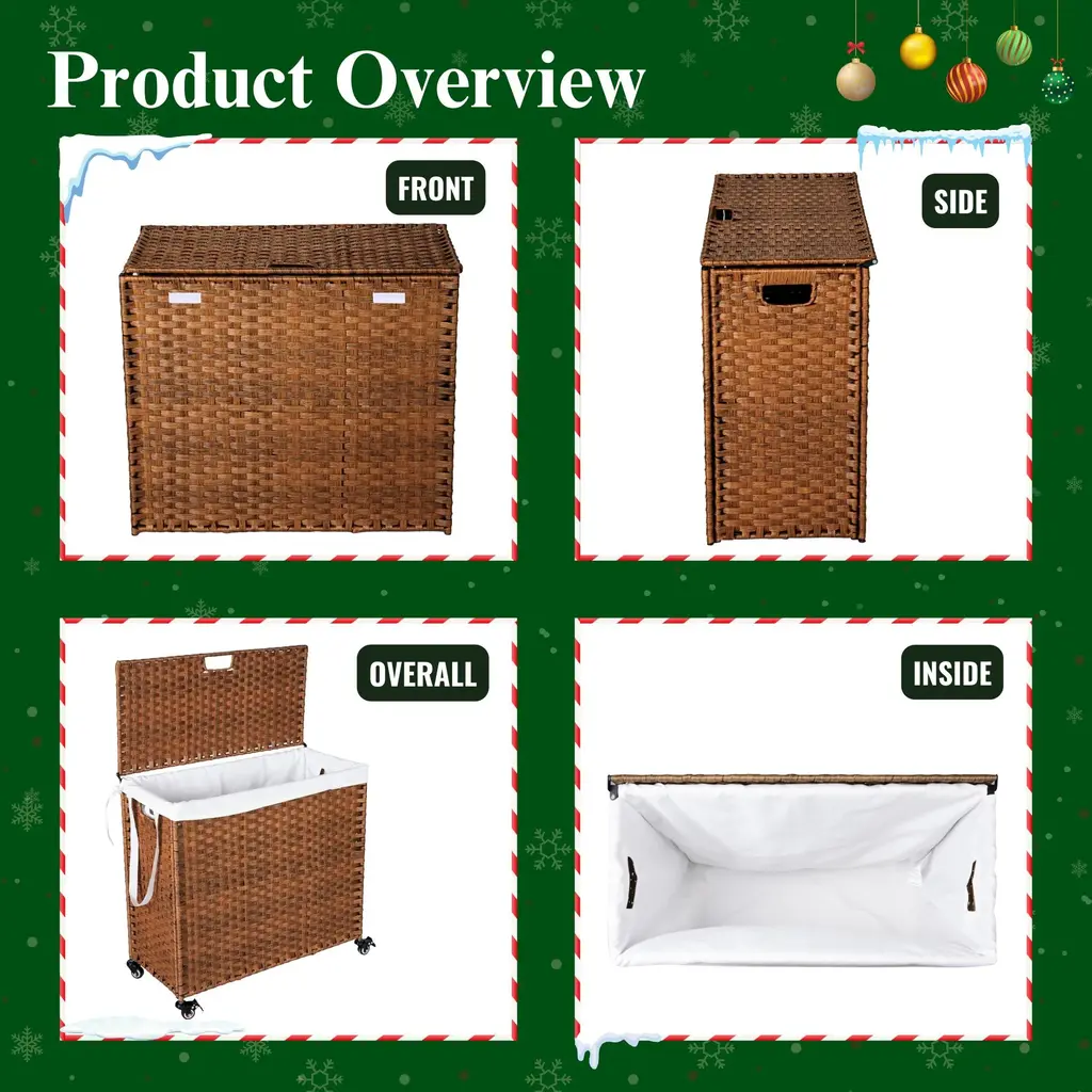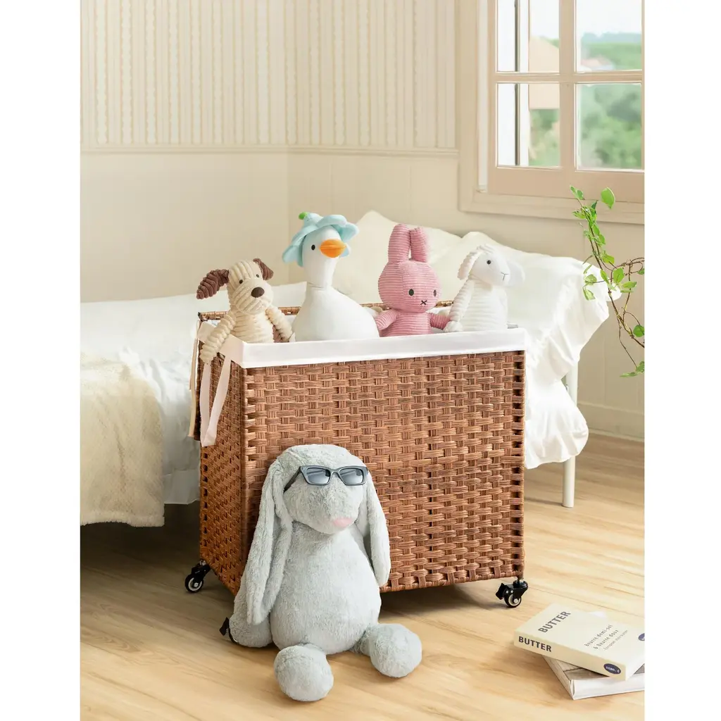Laundry Hamper With Lid PE Rattan Powder Coating Frame Clothes Hampers with 02 Removable Bags, Wheels, 160L, Brown Color.Features:Specification: