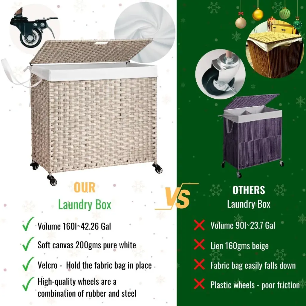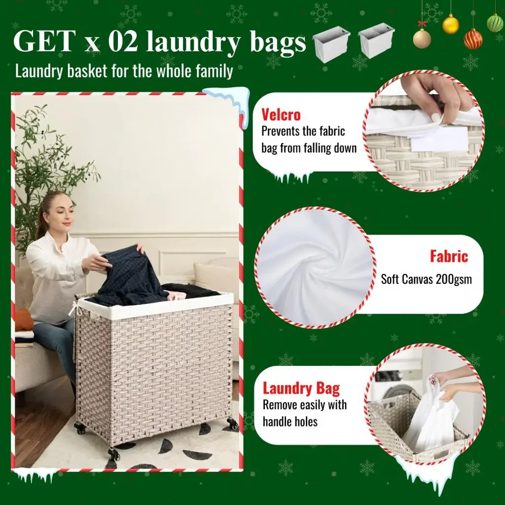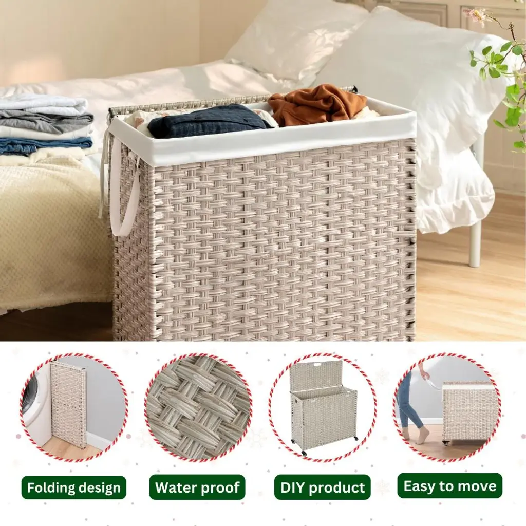 Your companion in every space in your family from the laundry area, bathroom or bedroom. More creatively, it can also be used as a multi-purpose storage box for household items such as children's toys, mattresses, pillows, blankets or swimming pool equipment.Features: ✅ SATISFIED IN EVERY DETAIL - With research and improvements, our clothes hamper is equipped with velcros on both sides of the clothes hamper to ensure the hamper bags do not fall when filled with clothes. Instead of using plastic wheels, our wicker laundry basket uses steel and rubber wheels that are friendly to your floors and more durable. ✅ PREMIUM MATERIAL - Laundry organizer is designed in knock-down form to save space when not in use. Made of eco-friendly plastic rattan wicker with unique natural-looking patterns, the durable powder-coated steel frame comes with two washable and removable laundry bags made from 200gsm soft canvas. There is a one-compartment bag and a two-compartment bag for easy classification of clothes. ✅ WHY NEED A LAUNDRY BASKET? - Optimizing usable space is always a top factor for small and medium sized homes, using storage baskets is the optimal choice to help the home space look tidy, neat and scientific. In particular, using a laundry basket also helps you easily classify white and colored clothes to save time when washing. ✅ WHAT WILL YOU GET? - A laundry basket set includes - 01 laundry basket with lid 27 inch length x 13.38 inch width x 26.18 inch height with loading capacity at 160 L ~ 42.26 ; 02 laundry bags with one compartment and two compartments; a set of 04 wheels; clear installation instructions.
